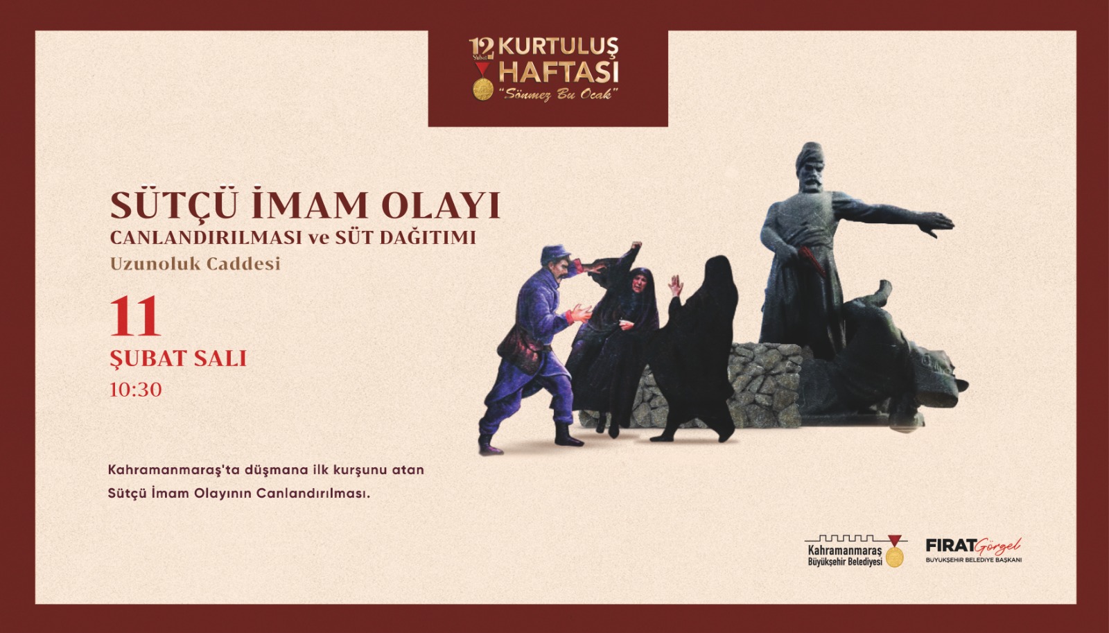 11 Şubat Salı günü saat 10.00’da şehir protokolünün katılımıyla Trabzon Caddesi’ndeki eski Valilik binası önünde çelenk sunma töreni düzenlenecek. Saat 10.30’da Uzunoluk Caddesi’nde Sütçü İmam Olayı’nın canlandırılmasıyla milli mücadelenin önemli anları yeniden yaşatılacak. 10.45’te Sütçü İmam Türbesi ve saat 11.15’te Şeyhadil Mezarlığı’nda şehitlik ziyareti gerçekleştirilecek. Aynı gün akşam saat 19.30’da 12 Şubat Parkı’ndan Necip Fazıl Kısakürek Kültür Merkezi’ne kadar kortej yürüyüşü düzenlenecek. Yürüyüş boyunca vatandaşlar ellerinde Türk bayrakları ve meşalelerle kurtuluş coşkusuna ortak olacak.