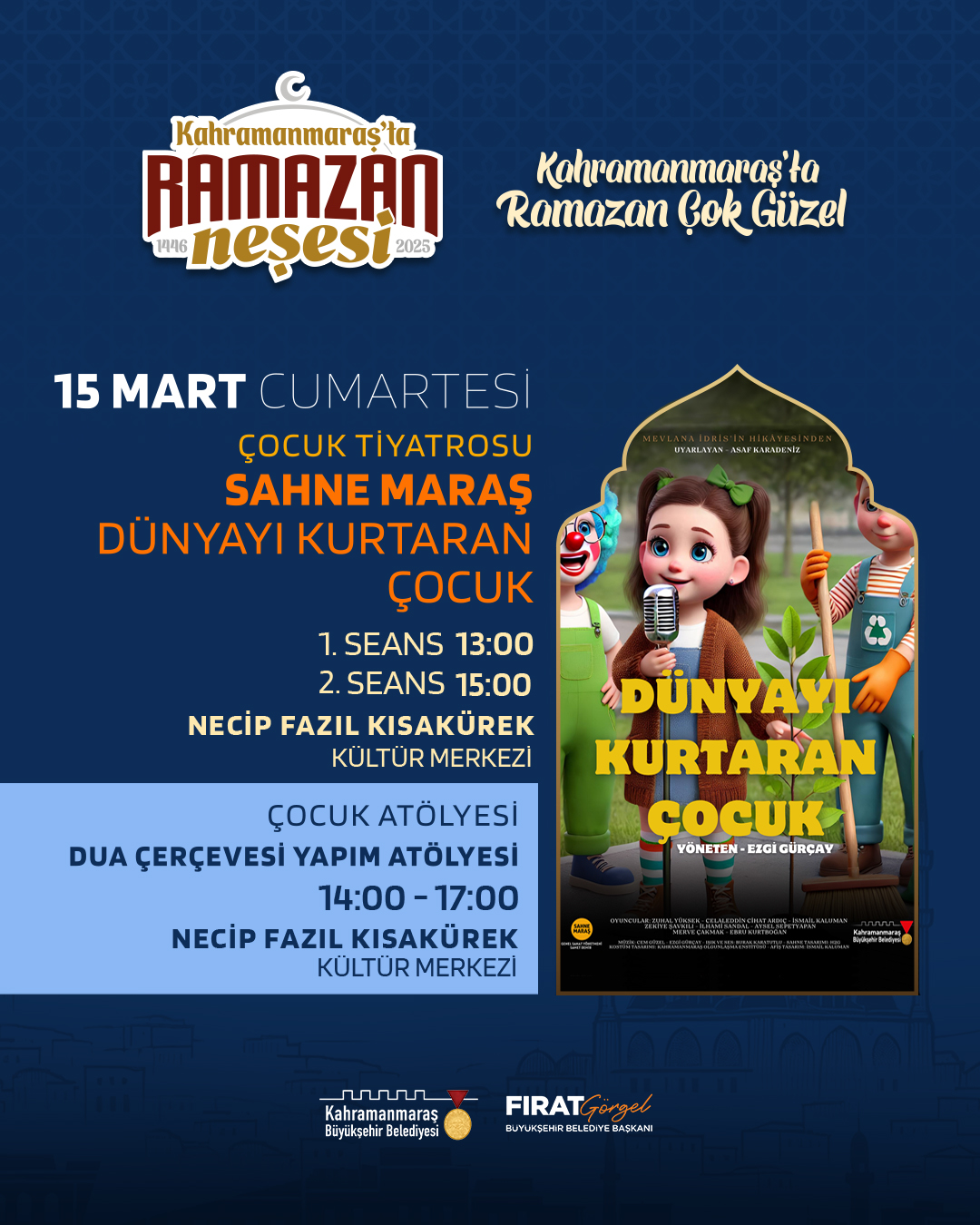 Ramazan etkinlikleri çerçevesinde sahnelenecek tiyatro oyunu, Türk edebiyatının önemli isimlerinden Mevlana İdris’in hikâyesinden uyarlanan “Dünyayı Kurtaran Çocuk” olacak. Sahne Maraş Tiyatro Okulu öğrencilerinin sahneleyeceği bu özel oyun, çocukları eğlendirirken aynı zamanda onlara değerli mesajlar da verecek. Necip Fazıl Kısakürek Kültür Merkezi’nde sahnelenecek gösterim, 13.00 ve 15.00 saatlerinde iki seans halinde minik izleyicilerle buluşacak.