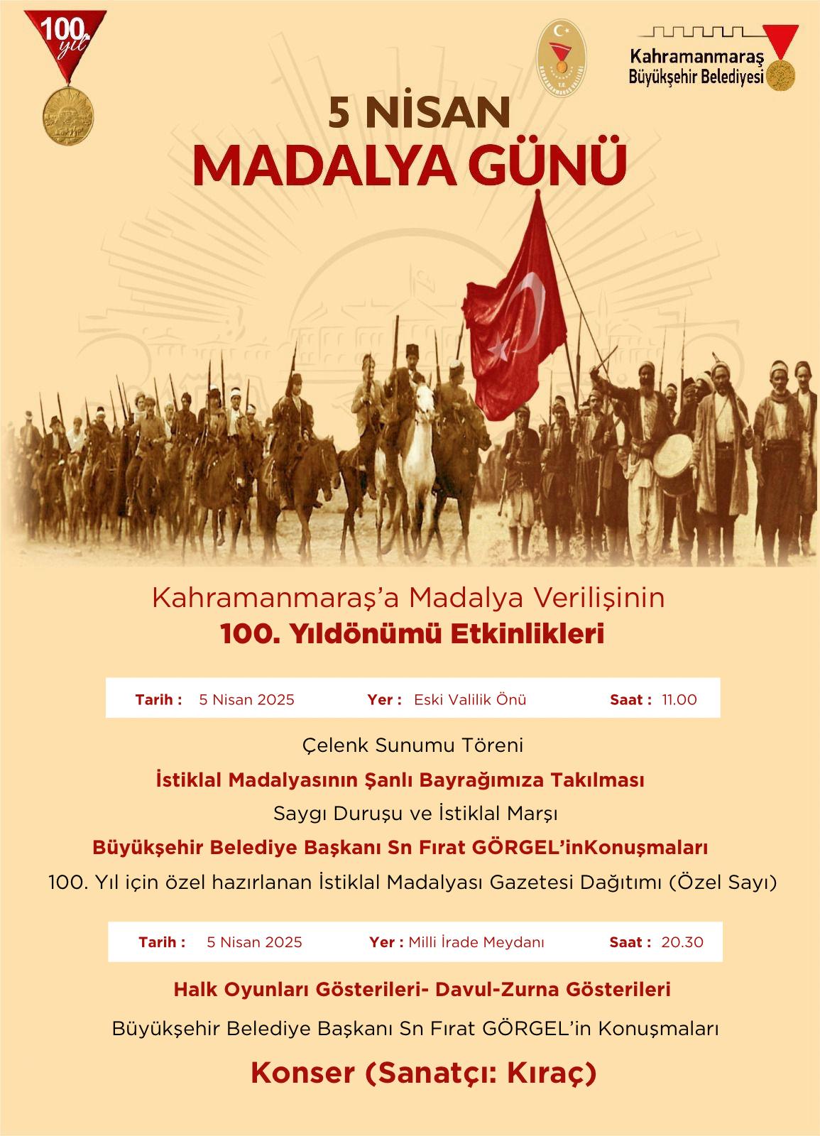 Kurtuluş Savaşı’nda gösterdiği kahramanlıkla Anadolu’daki bağımsızlık mücadelesine öncülük eden ve tüm mazlum milletlere ilham kaynağı olan Kahramanmaraş’a TBMM tarafından İstiklal Madalyası verilişinin 100. yıl dönümü Büyükşehir Belediyesi ve Valilik iş birliğiyle düzenlenecek bir dizi programla kutlanacak. Madalya Günü kutlama programı, 5 Nisan Cumartesi günü Trabzon Caddesi’ndeki eski Valilik binası önünde gerçekleştirilecek. Saat 11.00’da başlayacak etkinliklerde, şehre İstiklal Madalyası verilişinin 100. yılı, geçmişin aziz hatırasına saygı ve minnetle yâd edilecek. Tarihi anlara tanıklık edecek etkinlikler kapsamında, şehir halkının milli mücadele ruhunu yeniden hissedeceği çeşitli programlar düzenlenecek.