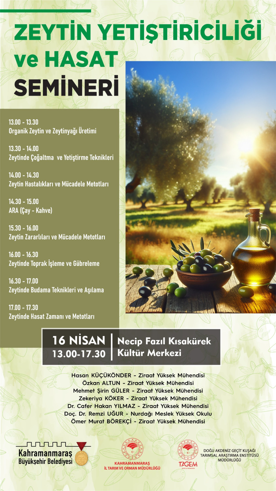 Büyükşehir Belediyesi, paydaş kurumlar iş birliğiyle 16 Nisan Çarşamba günü NFK Kültür Merkezi’nde “Zeytin Yetiştiriciliği ve Hasat” semineri düzenleyecek. Seminerde, alanında uzman ziraat mühendisleri tarafından üreticilere zeytin tarımıyla ilgili birçok başlıkta kapsamlı bilgiler aktarılacak.