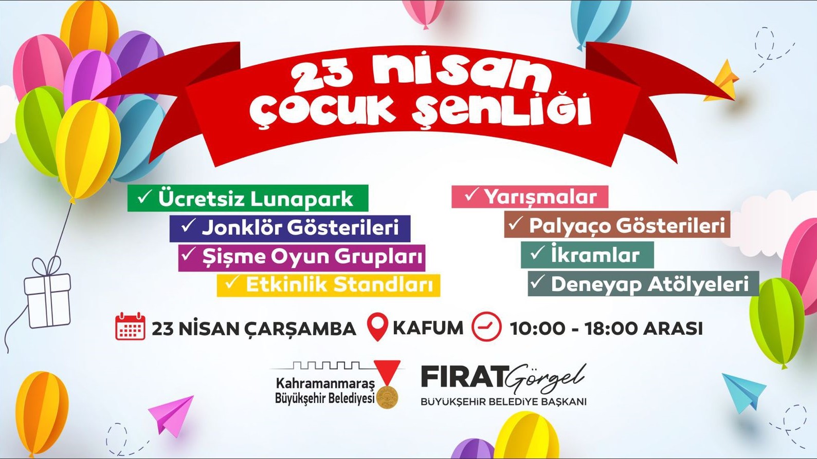 Kahramanmaraş Büyükşehir Belediyesi, 23 Nisan Ulusal Egemenlik ve Çocuk Bayramı dolayısıyla çocuklara unutulmaz bir bayram coşkusu yaşatmaya hazırlanıyor. Başkan Fırat Görgel öncülüğünde yıl boyunca çocuklara yönelik birçok eğitici ve eğlenceli etkinlik düzenleyen Büyükşehir Belediyesi, 23 Nisan’da da kapsamlı bir şenlik organize edecek. Kahramanmaraş Fuar Alanı’nda (KAFUM) gerçekleştirilecek etkinlikler, 23 Nisan Çarşamba günü saat 10.00’da başlayacak ve akşam 18.00’a kadar devam edecek. Şenlik kapsamında çocuklar; lunapark oyuncaklarından şişme oyun gruplarına, jonglör ve palyaço gösterilerinden dene-yap atölyelerine kadar birbirinden renkli ve öğretici aktivitelerle buluşacak. Çeşitli yarışmalar ve sürpriz etkinliklerle zenginleştirilen organizasyon, çocukların hem eğlenmesini hem de yeni deneyimler kazanmasını sağlayacak. Büyükşehir Belediyesinden yapılan açıklamada, tüm çocuklar ve aileleri bu özel güne katılmaya davet edildi.