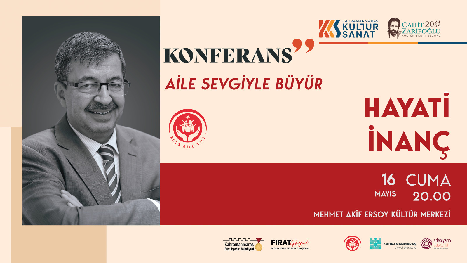 Büyükşehir Belediyesi, 2025 Aile Yılı kapsamında 16 Mayıs Cuma günü Mehmet Akif Ersoy Kültür Merkezi’nde yazar Hayati İnanç’ın katılımıyla “Aile Sevgiyle Büyür” temalı konferans düzenleyecek.
