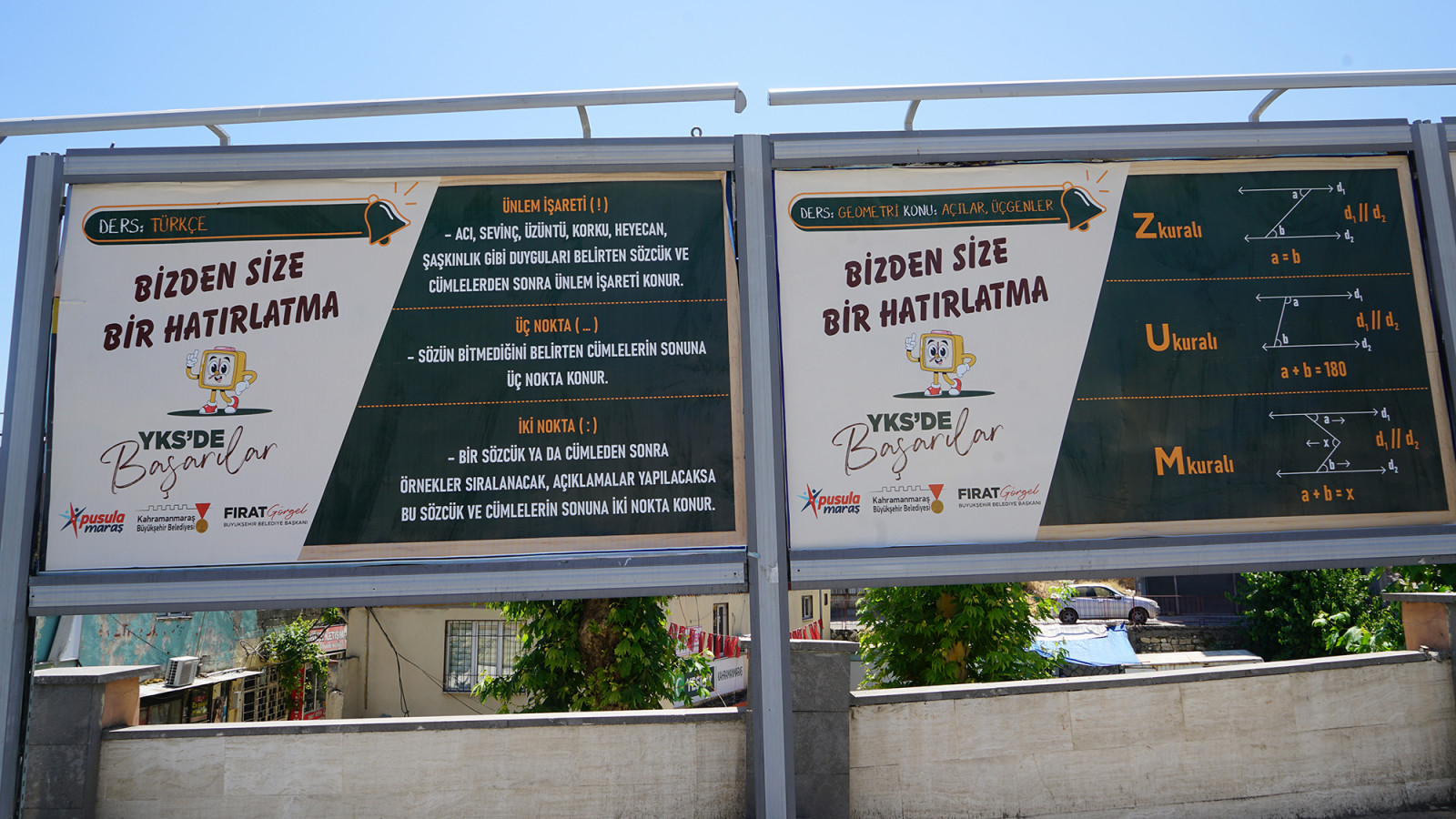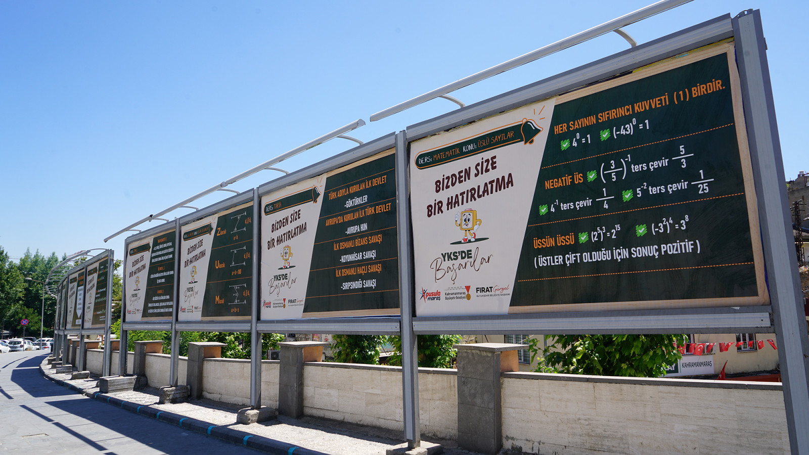 Eğitimden sanata, spordan kültüre geniş bir yelpazede sunduğu desteklerle gençlerin gelişimine ve potansiyellerini tam anlamıyla ortaya koymalarına olanak tanıyan Kahramanmaraş Büyükşehir Belediyesi, 21 ve 22 Haziran tarihlerinde gerçekleştirilecek Yükseköğretim Kurumları Sınavı (YKS) öncesi öğrencilerin son tekrarlarını keyifli hale getirmeleri için açık hava reklam alanlarını sınavlara yönelik kısa ve öz bilgi notlarıyla donattı. Türkçeden matematik ve fen bilimlerine, geometriden sosyal bilgilere kadar birçok dersten özenle seçilen kritik konu başlıkları, üniversite adaylarının günlük yaşamlarında sıklıkla karşılaştıkları noktalara yerleştirildi.
