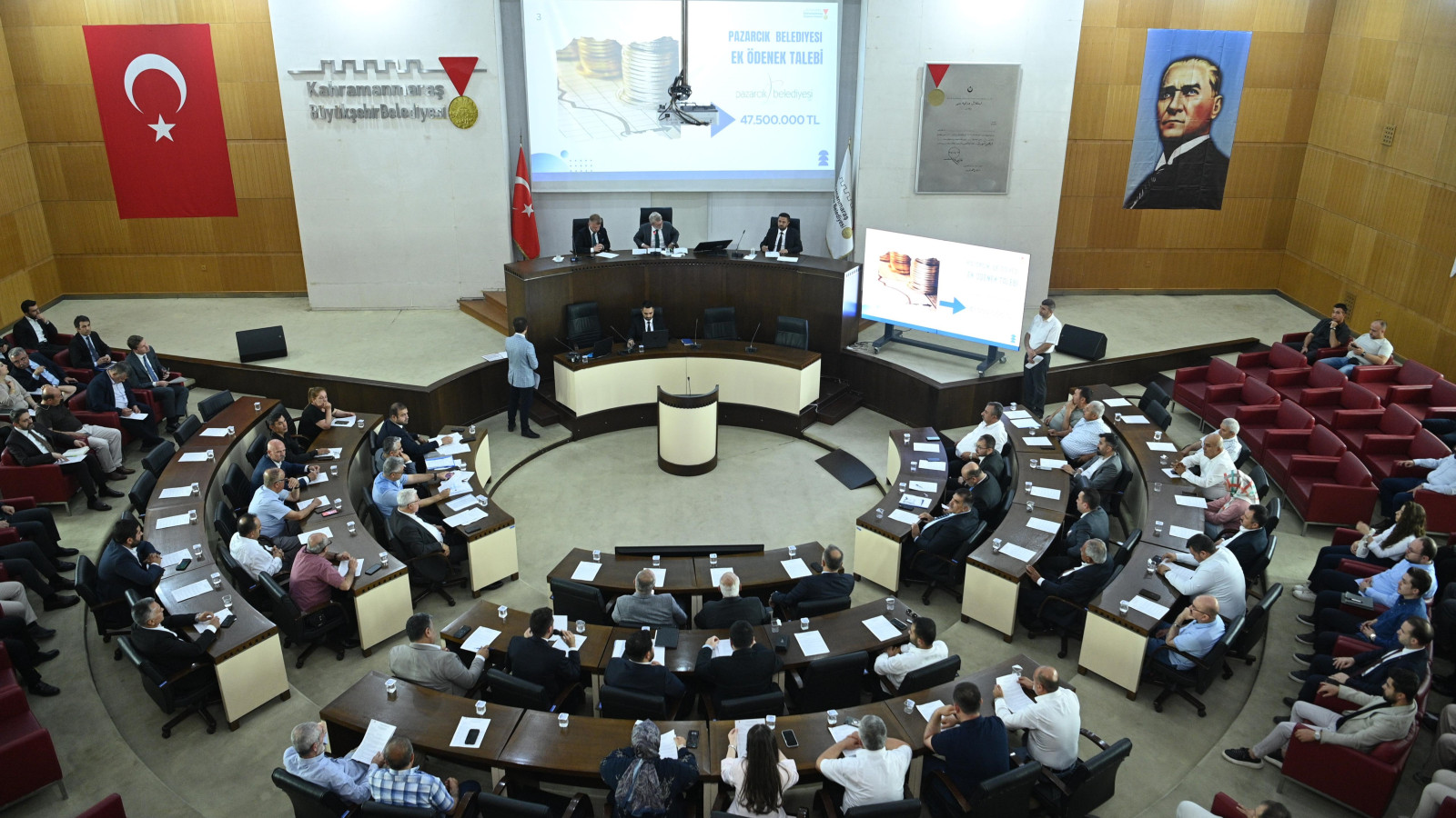Kahramanmaraş Büyükşehir Belediyesi Haziran Ayı Olağan Meclis Toplantısı, Büyükşehir Belediye Başkanı Fırat Görgel’in başkanlığında gerçekleştirildi. Meclis Toplantı Salonu’nda yapılan toplantıya, ilçe belediye başkanları ile meclis üyeleri de katıldı. Geniş katılımla düzenlenen toplantıda, şehrin gelişimine katkı sağlayacak önemli kararlar alındı. Toplam 66 gündem maddesinin görüşüldüğü toplantıda, şehir genelinde yürütülecek yatırımlar masaya yatırıldı. Toplantının dikkat çeken başlıklarından biri ise, kamu hizmetlerinin daha etkin şekilde sürdürülmesi amacıyla Büyükşehir Belediyesinin araç filosunun güçlendirilmesine yönelik alınan karar oldu. Meclis üyelerinin oy birliğiyle alınan karara göre; Büyükşehir Belediyesi filosuna 3 adet arazöz ve 1 adet kamyonet daha kazandırılacak. Böylece temizlik gibi hizmetlerde daha hızlı ve etkili müdahale imkânı sağlanmış olacak. Toplantı dilek ve temennilerle noktalandı.