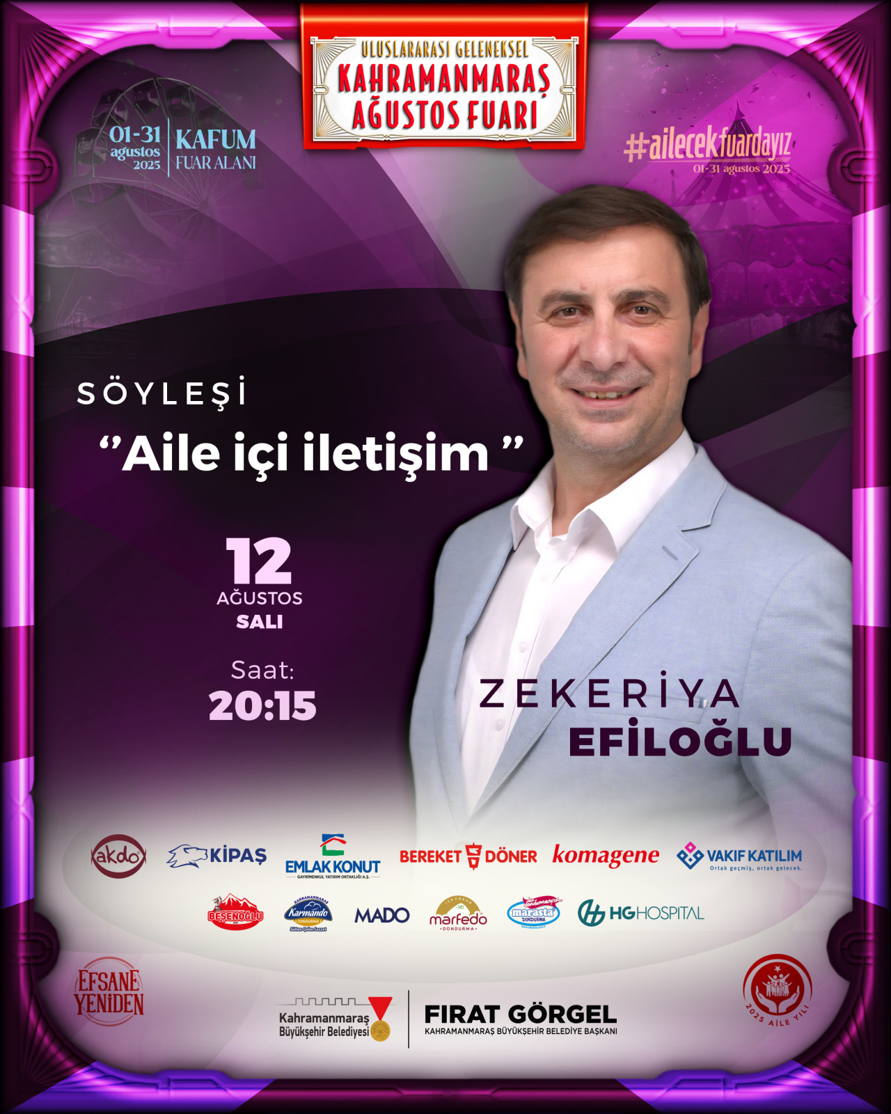 Kahramanmaraş Büyükşehir Belediyesinin düzenlediği Uluslararası Geleneksel Ağustos Fuarı’nda 10 gün geride kalırken, her yaş grubuna hitap eden etkinlikler hız kesmeden devam ediyor. Fuar alanında çocuklar için lunapark, eğlenceli yarışmalar, tiyatro gösterileri, müzikal şovlar, 10D sinema ve palyaço gösterileri gibi birbirinden renkli aktiviteler düzenlenirken; yetişkinler de çeşitli kültürel ve sanatsal programlarla fuarın keyfini yaşıyor. Bu kapsamda, 12 Ağustos Salı günü önemli bir isim Kahramanmaraşlılarla buluşacak. Eğitimci – yazar Zekeriya Efiloğlu, KAFUM Fuar Alanı’nda saat 20.15’te gerçekleştirilecek söyleşide vatandaşlarla bir araya gelecek. “2025 Aile Yılı” kapsamında düzenlenecek programda Efiloğlu, “Aile İçi İletişim” başlığı altında; ailenin önemi, temel değerleri ve korunması, sağlam toplum için ailenin yeri gibi konuları farklı perspektiflerden ele alacak. Katılımcılar, hem güncel hem de evrensel bakış açılarıyla desteklenmiş bilgilerle aile ilişkilerini güçlendirecek öneriler dinleme fırsatı bulacak. Büyükşehir Belediyesinden yapılan açıklamada, bu anlamlı etkinliğe tüm vatandaşların davetli olduğu belirtildi.