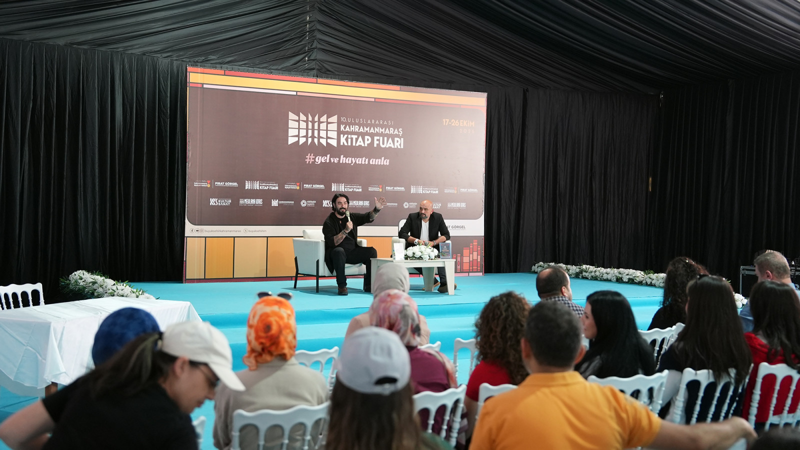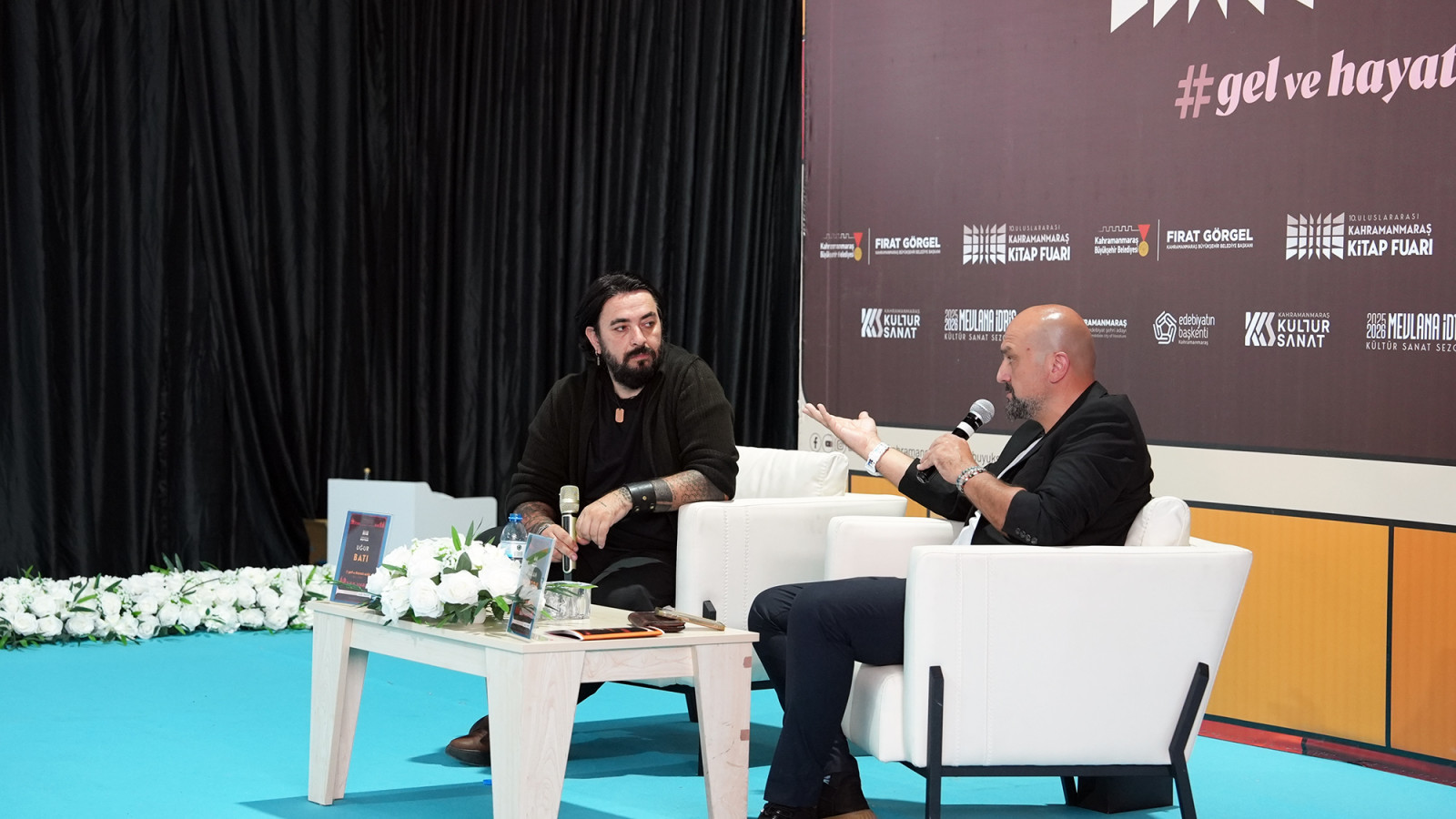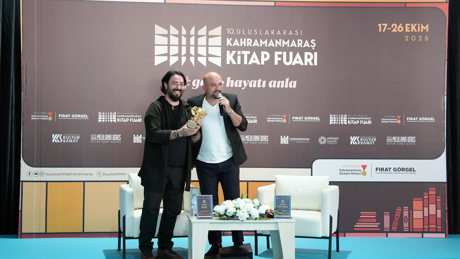 Kahramanmaraş Büyükşehir Belediyesinin düzenlediği 10. Uluslararası Kahramanmaraş Kitap Fuarı, ikinci gününde de yoğun ilgiyle devam ediyor. Her yaştan kitapseverin ziyaret ettiği fuarda, Türkiye’nin sevilen yazarlarından Uğur Batı ile eğitimci – yazar Prof. Dr. Esef Hakan Toytok, edebiyatseverlerle bir araya geldi. KAFUM’da gerçekleştirilen söyleşi programına okurlar büyük ilgi gösterdi. Dolu dolu geçen etkinlikte Batı ve Toytok; toplumsal değerler, bireysel ve toplumsal gelişim ile birey-toplum etkileşimi gibi pek çok konuyu farklı bakış açılarıyla ele aldı. Katılımcıların aktif olarak yer aldığı söyleşi hem düşünsel hem de duygusal yönüyle dikkat çekti. Programın ardından Uğur Batı, kitaplarını imzalayarak okurlarıyla birebir sohbet etme imkânı buldu.