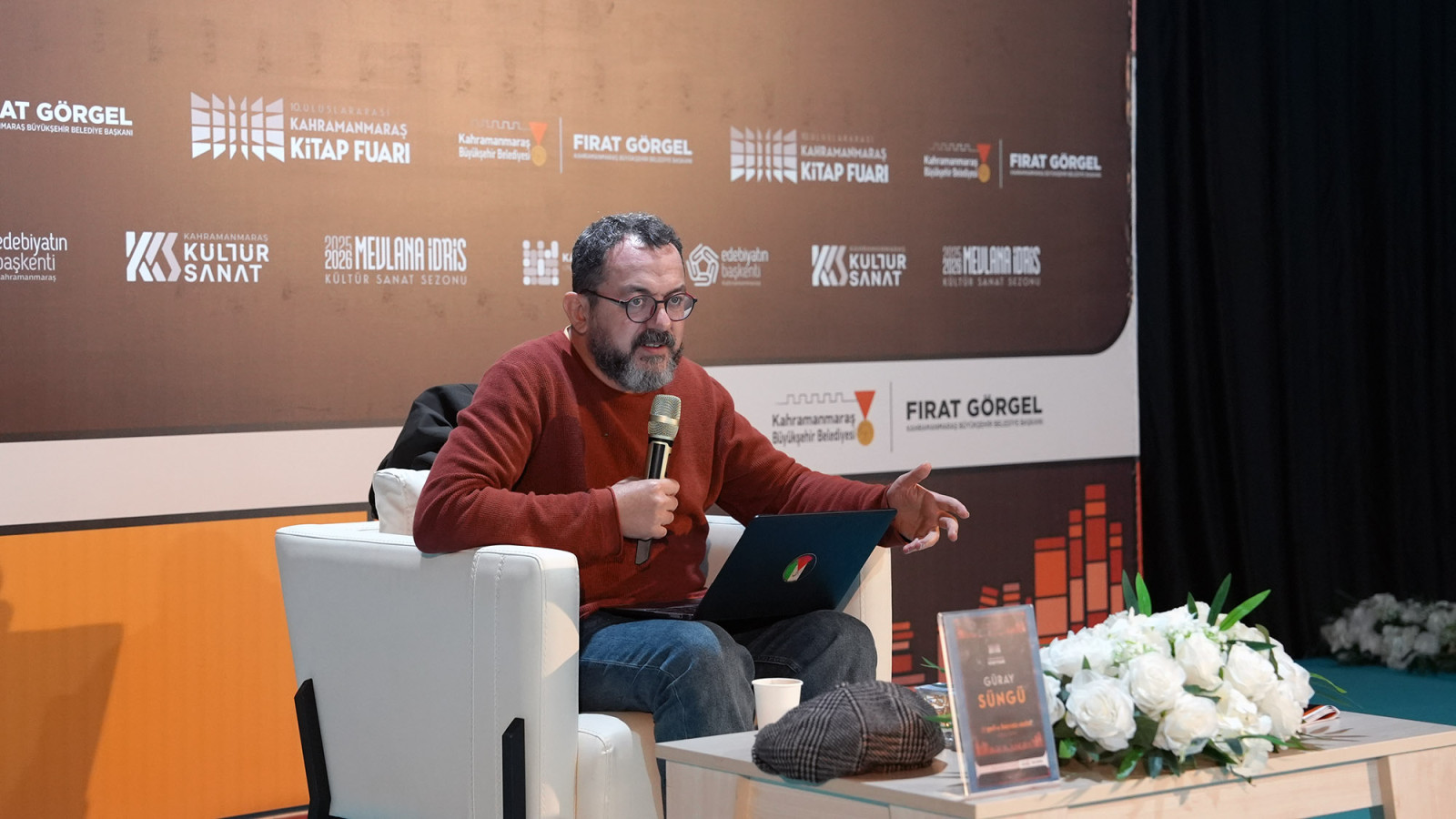 Kahramanmaraş’ın Yedi Güzel Adam’ın ve şairlerin şehri olduğunu ifade eden Güray Süngü, “Kahramanmaraş Kitap Fuarının onuncu yılı ve burada olmaktan çok mutluyum. Kitabı okurlara, gençlere ulaştırmaya çalışan çabalar çok kıymetli ve inşallah bu şekilde onlarca sene devam eder. Benim edebi kamuya girişim de bundan 15 sene önce bu tarz etkinlik vesilesi ile olmuştu ve Kahramanmaraş’ta gerçekleşmişti. O yüzden Kahramanmaraş’ın yeri bende özeldir. Zaten Yedi Güzel Adam’ın şehri, şairler şehri. Burada olmak çok güzel” ifadelerini kullandı.