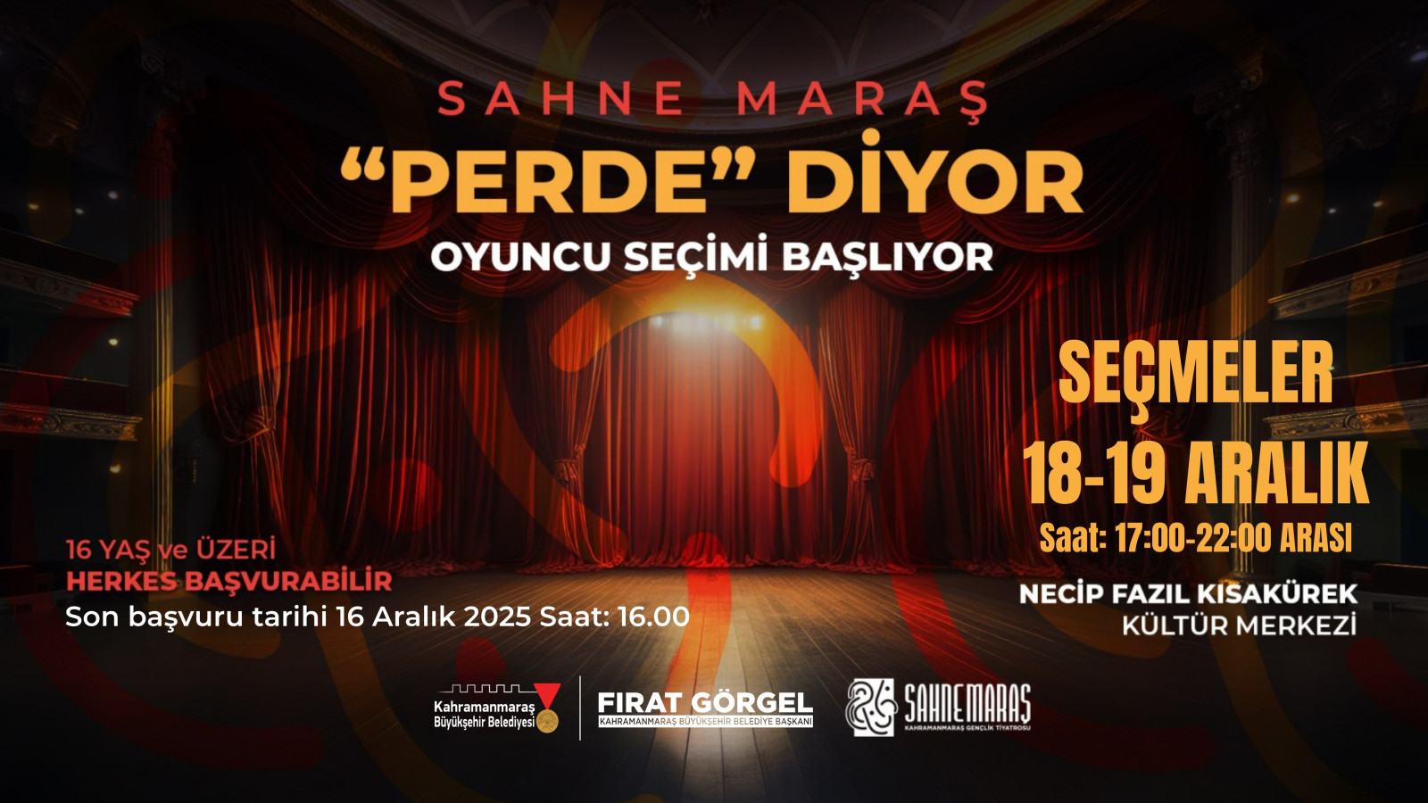 Tiyatro okuluna katılmak isteyen 16 yaş ve üzeri vatandaşlar, ön başvurularını https://kahramanmaras.bel.tr/duyuru/2025/12/11/sahne-maras-oyuncu-secmeleri-on-basvuru-formu internet adresinden çevrimiçi yapabiliyor. Başvurular, 16 Aralık Salı günü saat 16.00'a kadar devam edecek. Ön başvuruların tamamlanmasının ardından adaylar, 18 ve 19 Aralık tarihlerinde Necip Fazıl Kısakürek Kültür Merkezi’nde 17.00 - 22.00 saatleri arasında gerçekleştirilecek oyuncu seçmelerine katılacak. Adaylar, bu seçmelerde tiyatro okuluna kabul edilebilmek için sahne performanslarını sergileyecek ve jüri karşısında yeteneklerini ortaya koyacak.