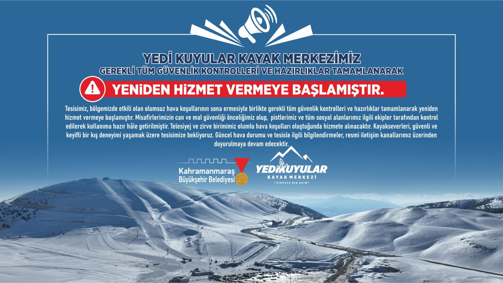 Büyükşehir Belediyesi, olumsuz hava koşulları nedeniyle geçici süreyle hizmete kapatılan Yedikuyular Kayak Merkezi’nin, gerekli güvenlik kontrolleri ve hazırlıkların tamamlanmasının ardından yeniden misafirlerini ağırlamaya başladığını duyurdu.