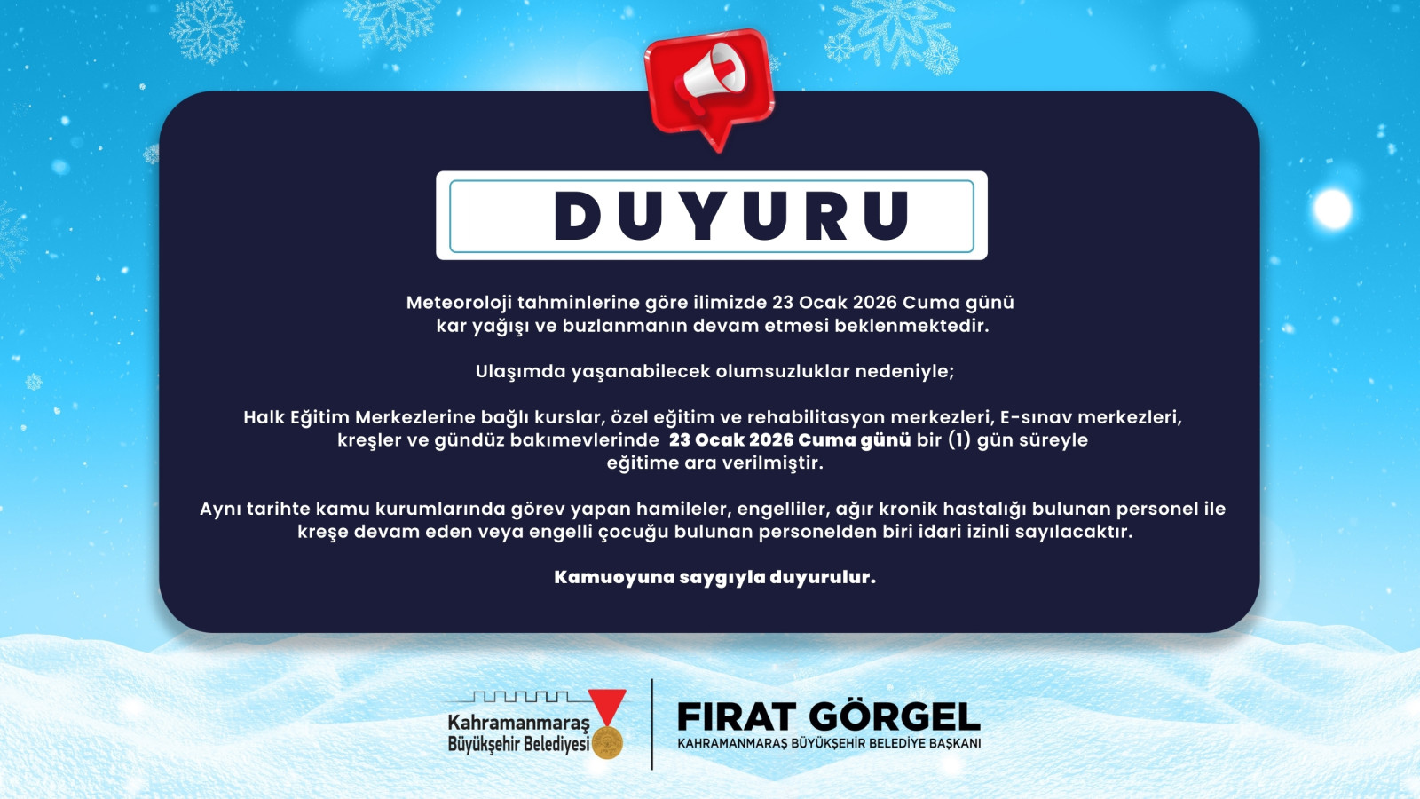 Şehir genelinde etkisini yeniden artıran olumsuz hava koşulları nedeniyle, 23 Ocak Cuma günü eğitim ve kamu hizmetlerine yönelik bir dizi tedbir kararı alındı. Vatandaşların can ve mal güvenliğinin korunması amacıyla alınan karar kapsamında, bazı eğitim kurumlarında eğitime 1 gün süreyle ara verildi. Halk eğitim merkezlerine bağlı kurslar, özel eğitim ve rehabilitasyon merkezleri, e-sınav merkezleri, kreşler ile gündüz bakım evlerinde 23 Ocak Cuma günü eğitim faaliyetleri durduruldu. Kararın, yoğun kar yağışı, buzlanma ve ulaşımda yaşanabilecek olası aksaklıklar göz önünde bulundurularak alındığı bildirildi. Öte yandan kamu kurumlarında görev yapan personeller için de idari izin düzenlemesine gidildi. Buna göre; hamile personeller, engelli çalışanlar, ağır kronik hastalığı bulunanlar ile kreşe devam eden çocuğu olan veya engelli çocuğu bulunan personellerden biri, 23 Ocak Cuma günü idari izinli sayılacak.