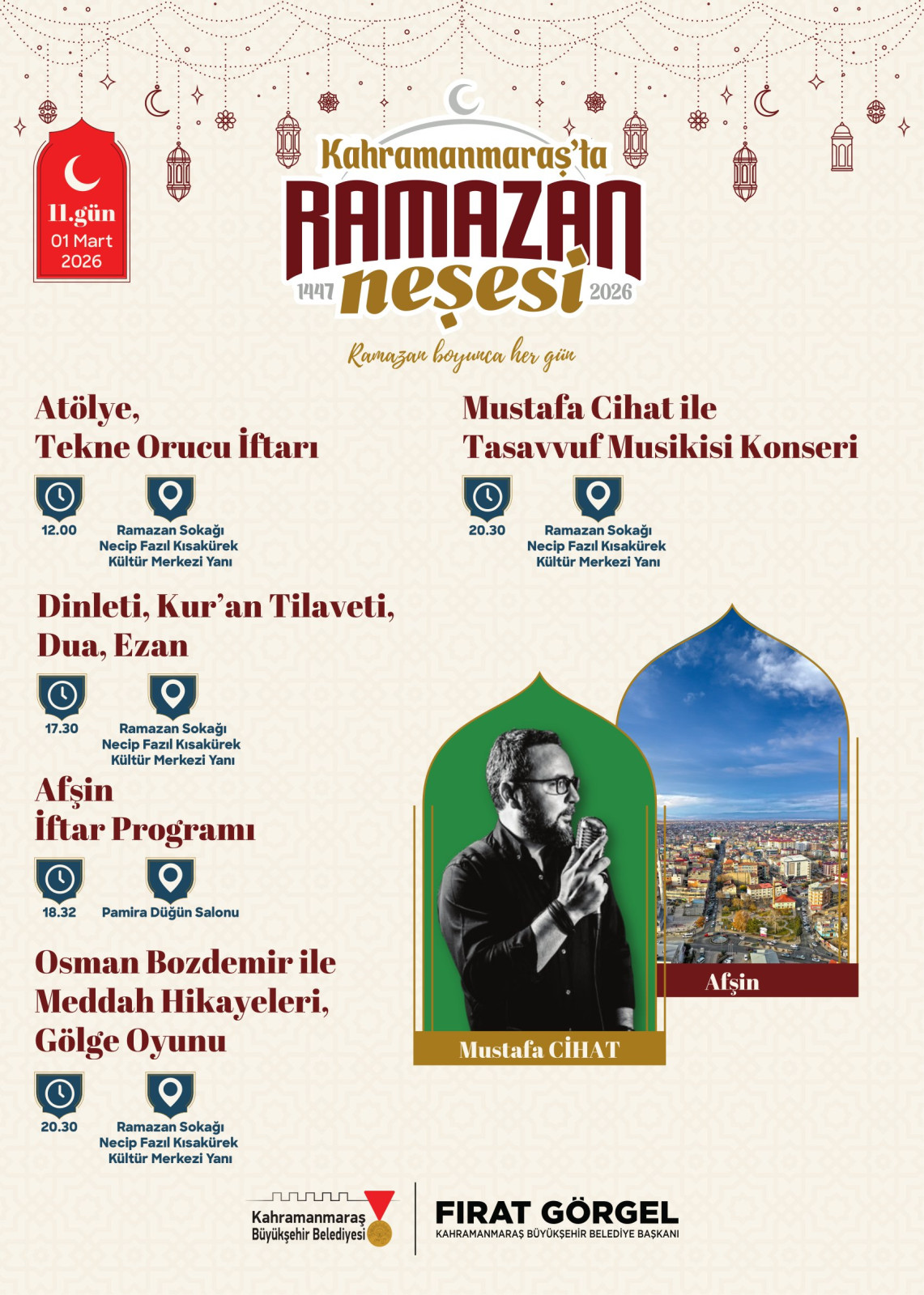 Ramazan etkinlikleri kapsamında birbirinden değerli isimler Ramazan Sokağı’nda Kahramanmaraşlılarla buluşacak. 21 Şubat Cumartesi günü tasavvuf musikisinin sevilen ismi Mustafa Belet sahne alacak. 24 Şubat Salı günü ilahiyatçı ve akademisyen Hasan Kâmil Yılmaz, Ramazan’ın manevi boyutunu ele alan sohbet programıyla vatandaşlarla buluşacak. 26 Şubat Perşembe günü yazar Yasin Pişgin söyleşisiyle gönüllere dokunacak. 1 Mart Pazar günü sanatçı Mustafa Cihat, tasavvuf musiki konseriyle Ramazan gecesine anlam katacak. 3 Mart Salı günü akademisyen yazar Ömer Demirbağ, sohbet programıyla katılımcılarla bir araya gelecek. 5 Mart Perşembe günü ilahiyatçı Mehmet Emin Ay, Ramazan’ın manevi derinliğine dair konuşmasıyla programa konuk olacak. 7 Mart Cumartesi günü müzisyen Agah Terzi, tasavvuf musiki dinletisiyle sahne alacak. 8 Mart Pazar günü psikolog yazar Hatice Kübra Tongar aile, çocuk ve maneviyat temalı sohbetiyle vatandaşlarla buluşacak. 12 Mart Perşembe günü yazar Osman Egin, söyleşi programıyla Ramazan akşamına renk katacak. 17 Mart Salı günü ise şair ve akademisyen Nurullah Genç, sohbet programıyla Ramazan Sokağı’nın konuğu olacak.