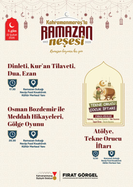 Büyükşehir Belediyesi tarafından yapılan açıklamada, Ramazan ayı boyunca gerçekleştirilecek tüm etkinliklerin ücretsiz olduğu ve vatandaşların programlara davetli olduğu ifade edildi. Etkinlik takvimine https://kahramanmaras.bel.tr/duyuru/2026/02/17/ramazan-ayi-etkinlik-takvimi internet adresi üzerinden ulaşılabileceği belirtilirken, Ramazan Sokağı’nın bu yıl şehrin manevi buluşma noktası olması hedefleniyor. Sanat, kültür ve maneviyatın iç içe geçtiği Ramazan programlarıyla Kahramanmaraş’ta Ramazan akşamlarının dolu dolu geçmesi planlanıyor.