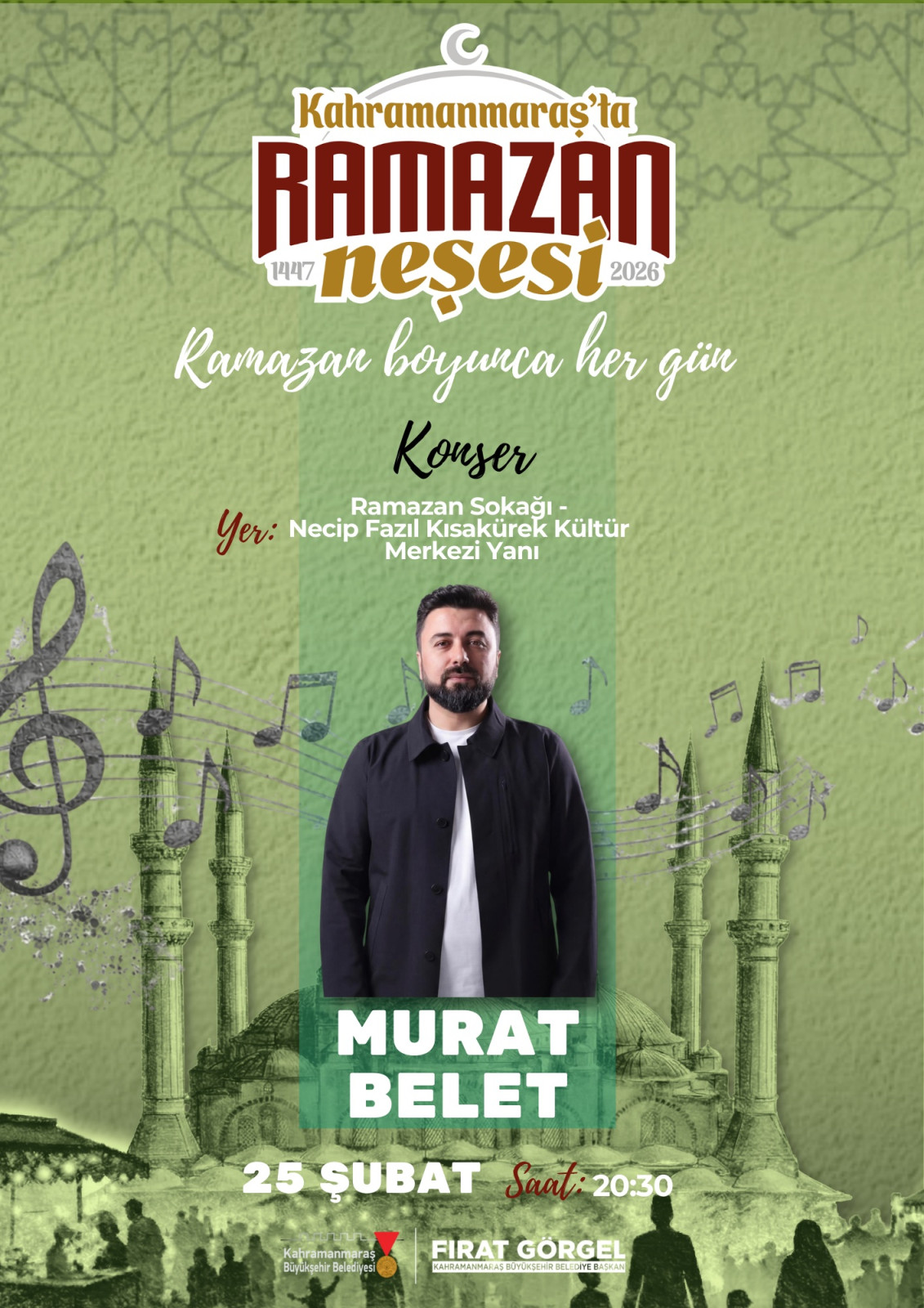 Ramazan ayının manevi atmosferini güçlendirmek amacıyla düzenlenen kültür ve sanat etkinlikleri, 25 Şubat Çarşamba günü gerçekleştirilecek özel bir musiki dinletisiyle devam edecek. Kahramanmaraş Büyükşehir Belediyesi tarafından organize edilen programda, sevilen sanatçı Murat Belet, Kahramanmaraşlılarla buluşacak. Etkinlik, Necip Fazıl Kısakürek Kültür Merkezi yanındaki Ramazan Sokağı’nda saat 20.30’da başlayacak. Ramazan akşamlarının huzur ve paylaşım iklimini pekiştirmeyi hedefleyen programda, tasavvufi ve manevi içerikli eserler seslendirilecek. Geniş bir dinleyici kitlesine hitap eden Murat Belet; “Yara Bende”, “Kara Sevda”, “Senle Mekke Medine”, “Dilerse Sultanım”, “Bir Yanım Gazze”, “Hicret”, “Medinedir Medine”, “Gül Ola” ve “Sana Geldim” gibi sevilen eserlerini müzikseverler için yorumlayacak. Duygu yüklü repertuvarıyla bilinen sanatçının, Ramazan’ın ruhuna uygun bir atmosfer oluşturacak. Büyükşehir Belediyesinden yapılan açıklamada, Ramazan ayının birlik, beraberlik ve kardeşlik duygularını pekiştirdiğine dikkat çekilerek, düzenlenen etkinliklerle vatandaşların hem manevi hem de kültürel anlamda zengin bir Ramazan geçirmesinin amaçlandığı belirtildi. Açıklamada ayrıca, tasavvuf musiki dinletisine tüm vatandaşların davetli olduğu ifade edildi.