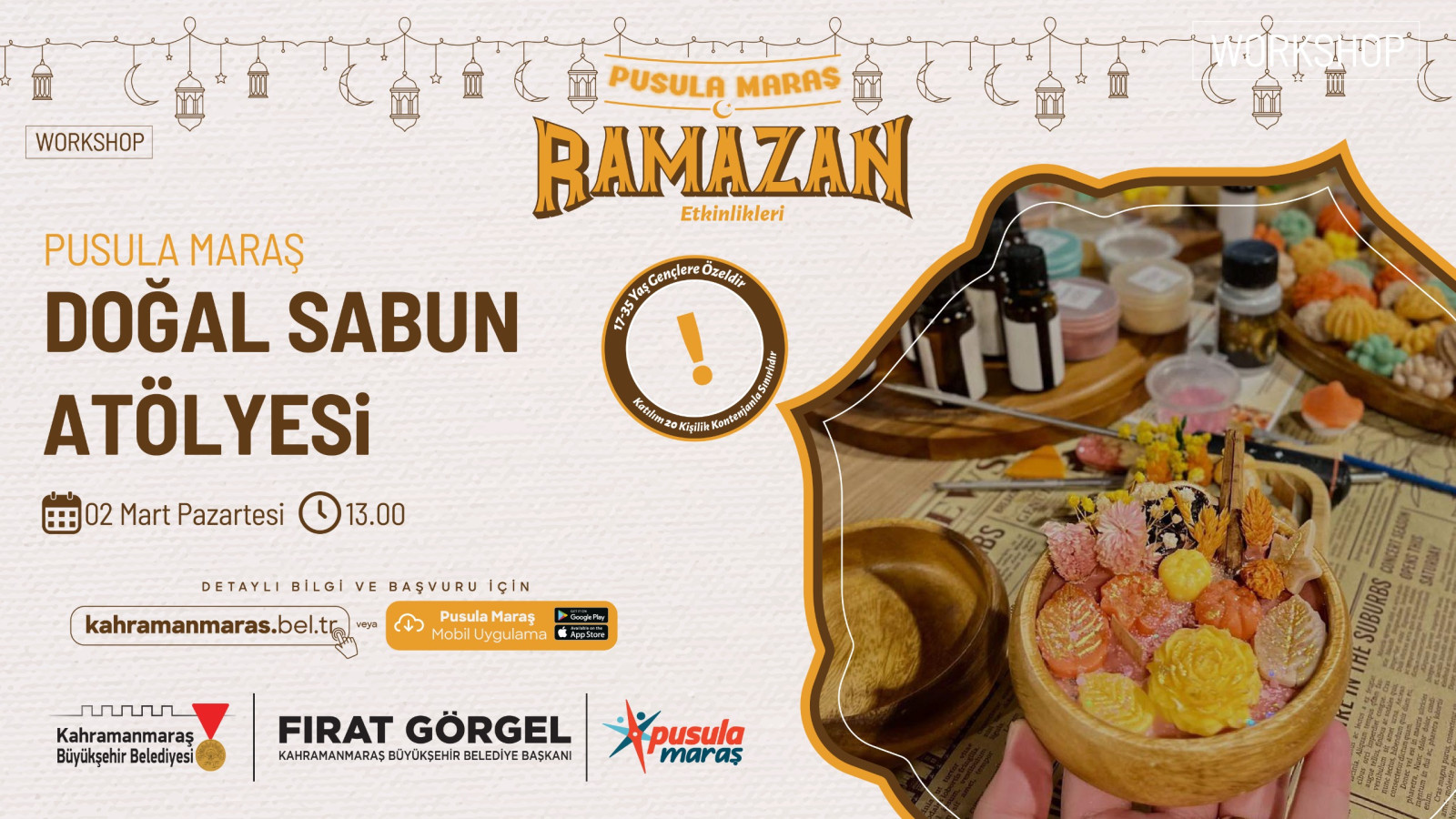 Kahramanmaraş Büyükşehir Belediyesinin gençlik markası Pusula Maraş, Ramazan ayının manevi atmosferini gençlerle buluşturacak etkinliklerine bir yenisini ekliyor. Ramazan’ın paylaşma, üretme ve öğrenme ruhunu gençlere aktarmayı amaçlayan Pusula Maraş, bu kez eğitici ve keyifli bir sabun yapımı atölyesi düzenleyecek. Gençlerin sosyal, kültürel ve geleneksel değerlerle buluşmasını hedefleyen program kapsamında gerçekleştirilecek atölye hem uygulamalı eğitim hem de yaratıcı deneyim fırsatı sunacak.