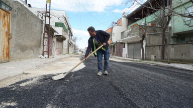 KASKİ, Dulkadiroğlu Namık Kemal Mahallesi 49023. Sokakta altyapı imalatlarının ardından sıcak asfalt serimini de tamamlıyor.