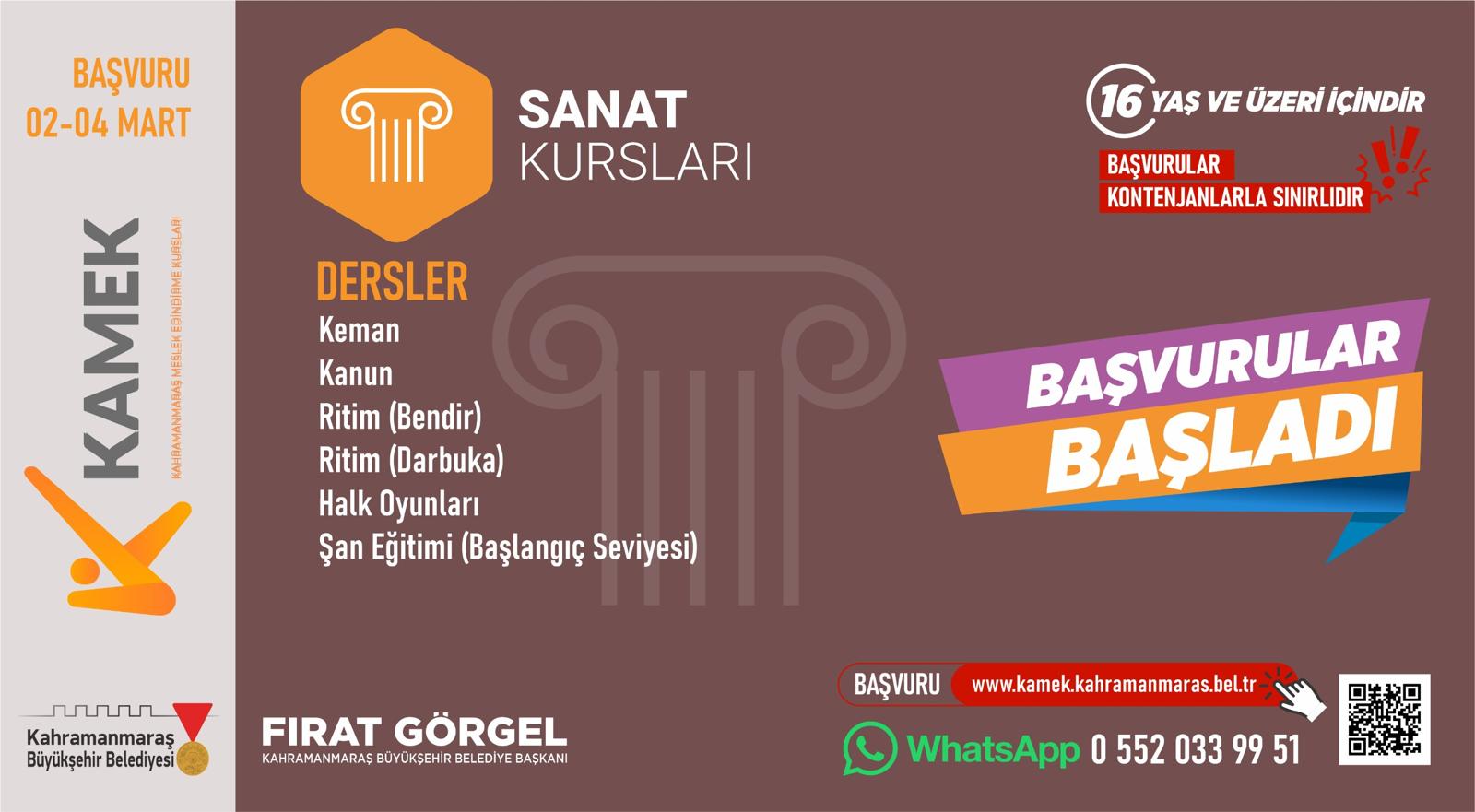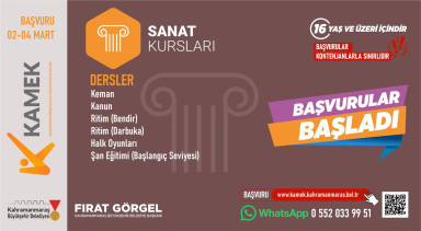 Kahramanmaraş Büyükşehir Belediyesi, vatandaşların kişisel gelişimlerine katkı sağlamak ve sosyal hayata daha aktif katılımlarını desteklemek amacıyla düzenlediği Meslek Edindirme ve Sanat Eğitimi Kursları’nda (KAMEK) bahar dönemini başlatıyor. Her yaştan vatandaşa hitap eden kurs programları, yeni dönemde de zengin içerikleriyle dikkat çekiyor. KAMEK’te bahar dönemi kapsamında toplam 26 farklı branşta ücretsiz eğitim verilecek. Mesleki gelişimi destekleyen programların yanı sıra sanat ve kişisel gelişim alanlarında da geniş bir yelpazede kurs imkânı sunulacak. Bu kapsamda; aşçı yardımcılığı ve yaş pasta yapımı gibi mutfak sanatlarına yönelik eğitimlerin yanı sıra İngilizce ve e-ticaret gibi çağın gereksinimlerine cevap veren kurslar da katılımcılarla buluşacak. Fotoğraf çekimi, diksiyon, karakalem resim, çini, keman ve halk oyunları gibi sanat ve kültür odaklı branşlar da yeni dönemde kursiyerlerini ağırlayacak. Alanında uzman eğitmenler tarafından verilecek eğitimlerle katılımcıların hem mesleki becerilerini geliştirmeleri hem de sosyal yönlerini güçlendirmeleri hedefleniyor. Teorik ve uygulamalı olarak gerçekleştirilecek dersler sayesinde kursiyerler, edindikleri bilgi ve deneyimi günlük yaşamlarına ve iş hayatlarına yansıtma fırsatı bulacak.