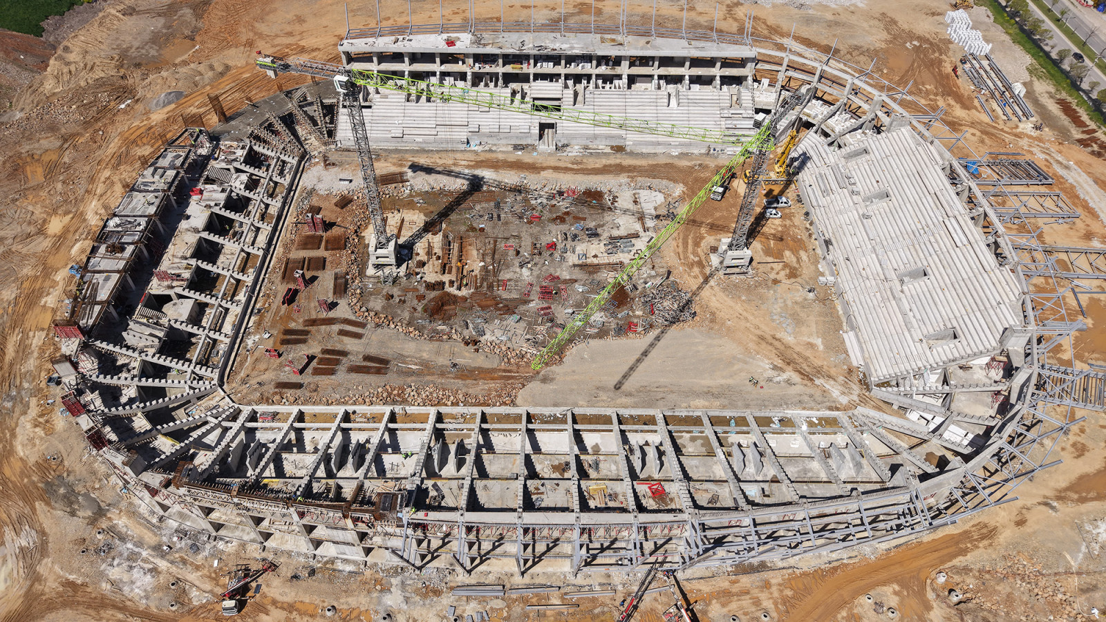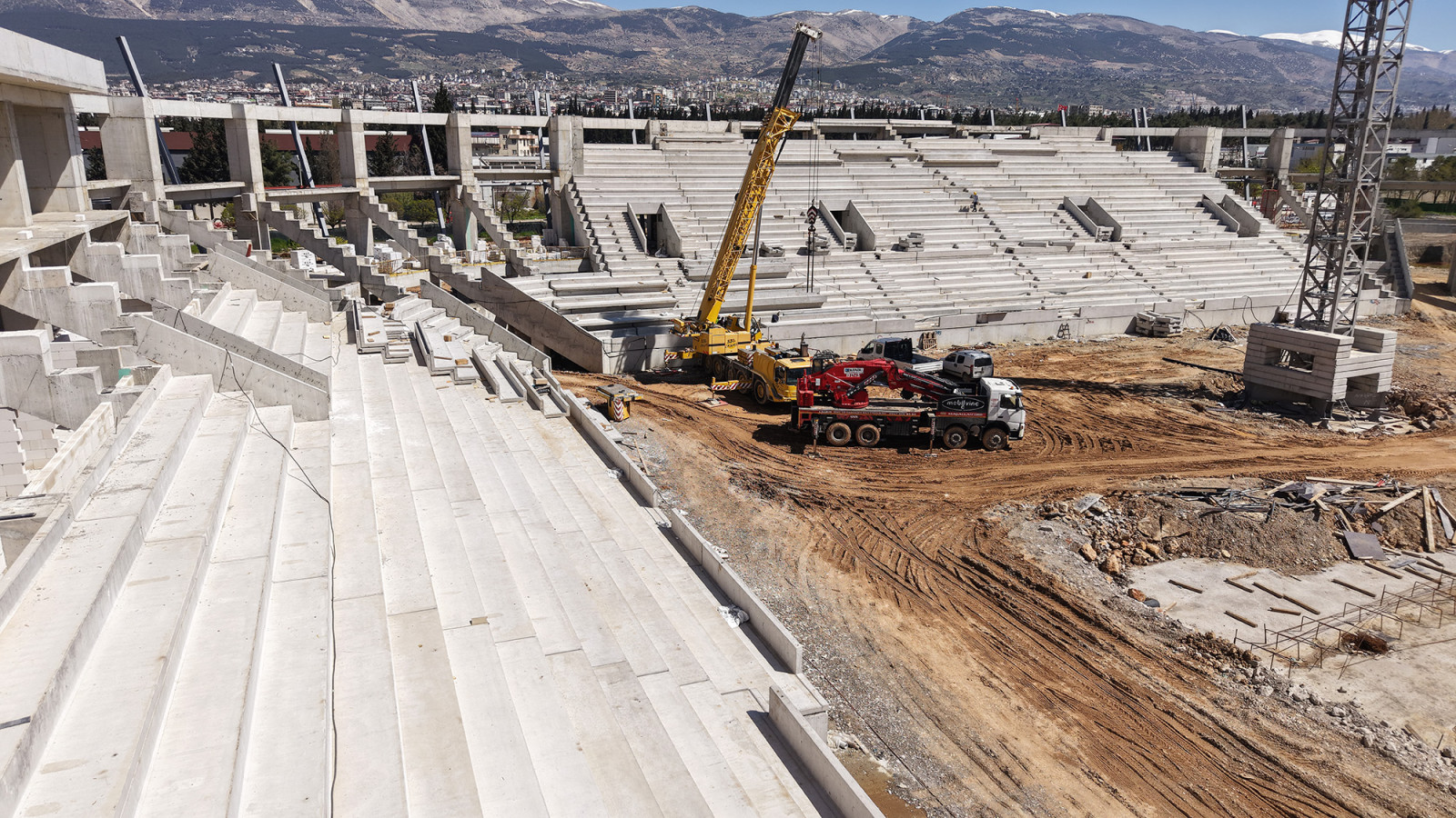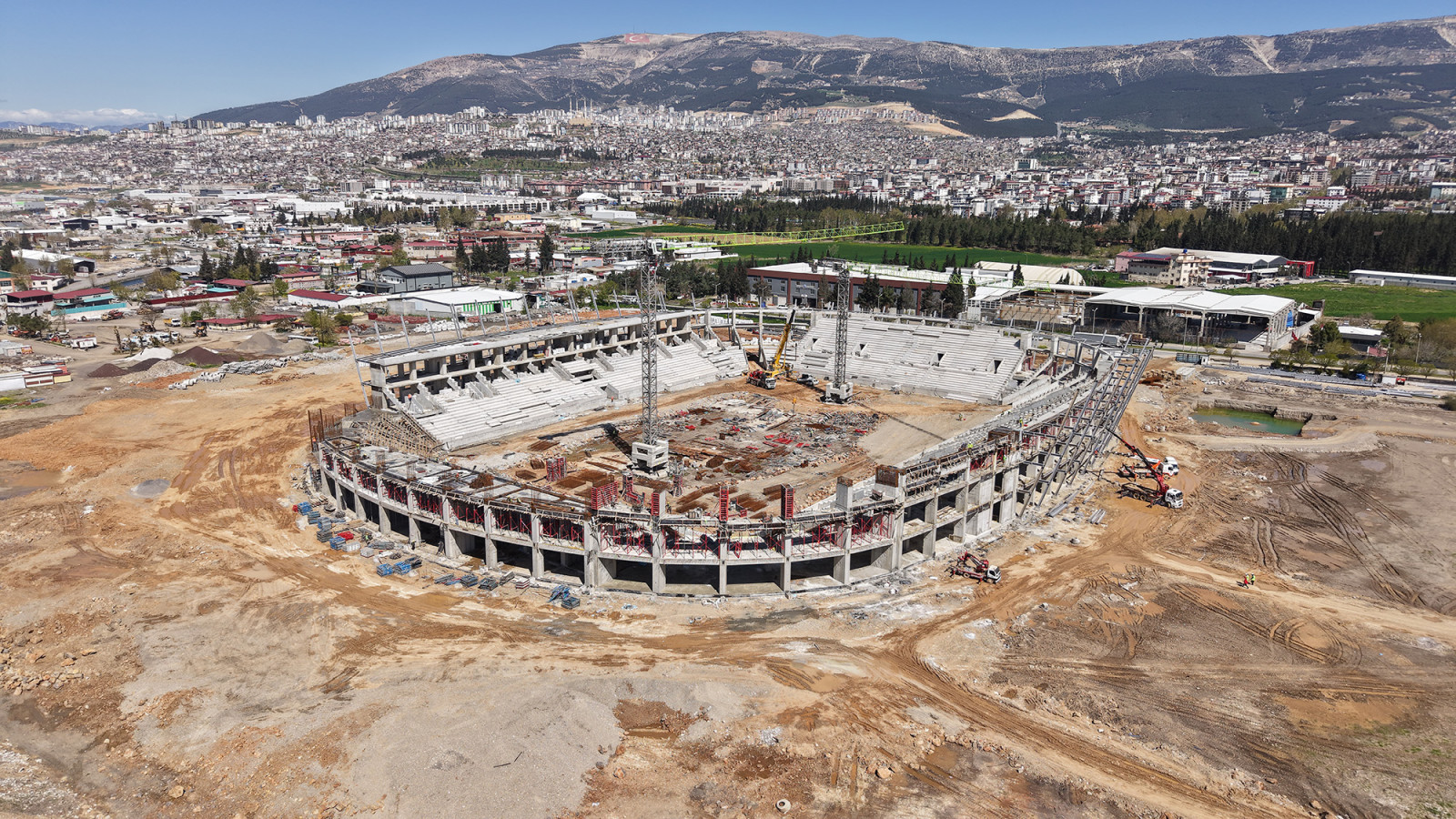 Dulkadiroğlu İstasyon Mahallesi’nde hayata geçirilen Yeni Kahramanmaraş Stadyumu’nun inşası hızla devam ediyor. Taşıyıcı sistemler büyük ölçüde tamamlanırken, ekipler eş zamanlı olarak çelik ve çatı imalatlarını gerçekleştiriyor.