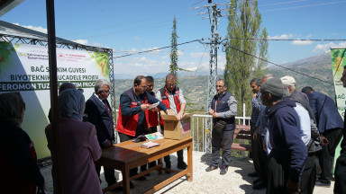 Çobanlı Mahalle Muhtarı Ramazan Çam, mahallelerinin temel geçim kaynağının üzüm bağcılığı olduğunu vurgulayarak, son yıllarda artan bağ güvesi nedeniyle ciddi verim kayıpları yaşandığını söyledi. Çam, “Mahallemizin geçim kaynağı üzüm bağcılığı. Ancak bağ güvesinin artırışından dolayı hasat miktarımız düşüyor, gelirimiz azalıyordu. Büyükşehir Belediyemiz ve Tarım İl Müdürlüğü iş birliğiyle hayata geçirilen proje kapsamında mahallemizdeki üreticilere feromon yayıcı çubuklar dağıtılıyor. Bunlar sayesinde inşallah bağ güvesi sayısında önemli azalış olacağını düşünüyorum. Ayrıca kimyasal bir ilaç olmadığı için hasat miktarımızı da düşürmeyecek. İnşallah bu yıl verimler daha artacak” dedi. Mahalle sakinlerinden Eyüp Kazıcı, “Bağ güvelerinden dolayı üretimde yıllardır zorluk çekiyorduk. Büyükşehir Belediyemizin sağladığı bu desteklerle artık çok daha verimli bir üretim olacağını düşünüyorum. Bu destek için Büyükşehir Belediye Başkanımız Fırat Görgel’e teşekkür ediyorum” ifadelerini kullandı. Ahmet Duran Ekici de, “Bağlarımız güveden dolayı her sene çürüyordu. Üzümlerimiz telef oluyordu. Bu destek sayesinde inşallah ilaçsız bir şekilde güvelerden kurtulacağız” cümlelerini kaydetti. Ramazan Ceyhan da bağ güvesine karşı uzun süredir çözüm aradıklarını belirterek, “İlaç kullanmadan tamamen doğal yöntemlerle mücadele edeceğiz. Bu uygulamanın önemli katkı sağlayacağına inanıyoruz” diye konuştu.