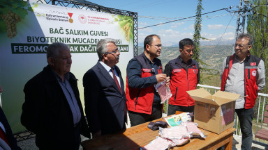 Büyükşehir Belediyesi, coğrafi işaretli Kabarcık Üzümü’nün anavatanı Bertiz bölgesinde üzüm bağlarında verim kaybına neden olan bağ güvesine karşı üreticilere feromon tuzak desteği sağlıyor. Yapılan çalışmayla salkım güvesinin kimyasal ilaç kullanılmadan, biyoteknik yöntemlerle kontrol altına alınması hedefleniyor.