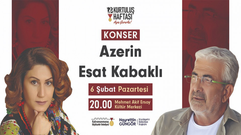 Büyükşehir Belediyesi, 12 Şubat Kurtuluş Haftası kutlama etkinlikleri çerçevesinde 6 Şubat Pazartesi günü Mehmet Akif Ersoy Kültür Merkezi’nde Azerin ve Esat Kabaklı konseri düzenleyecek.