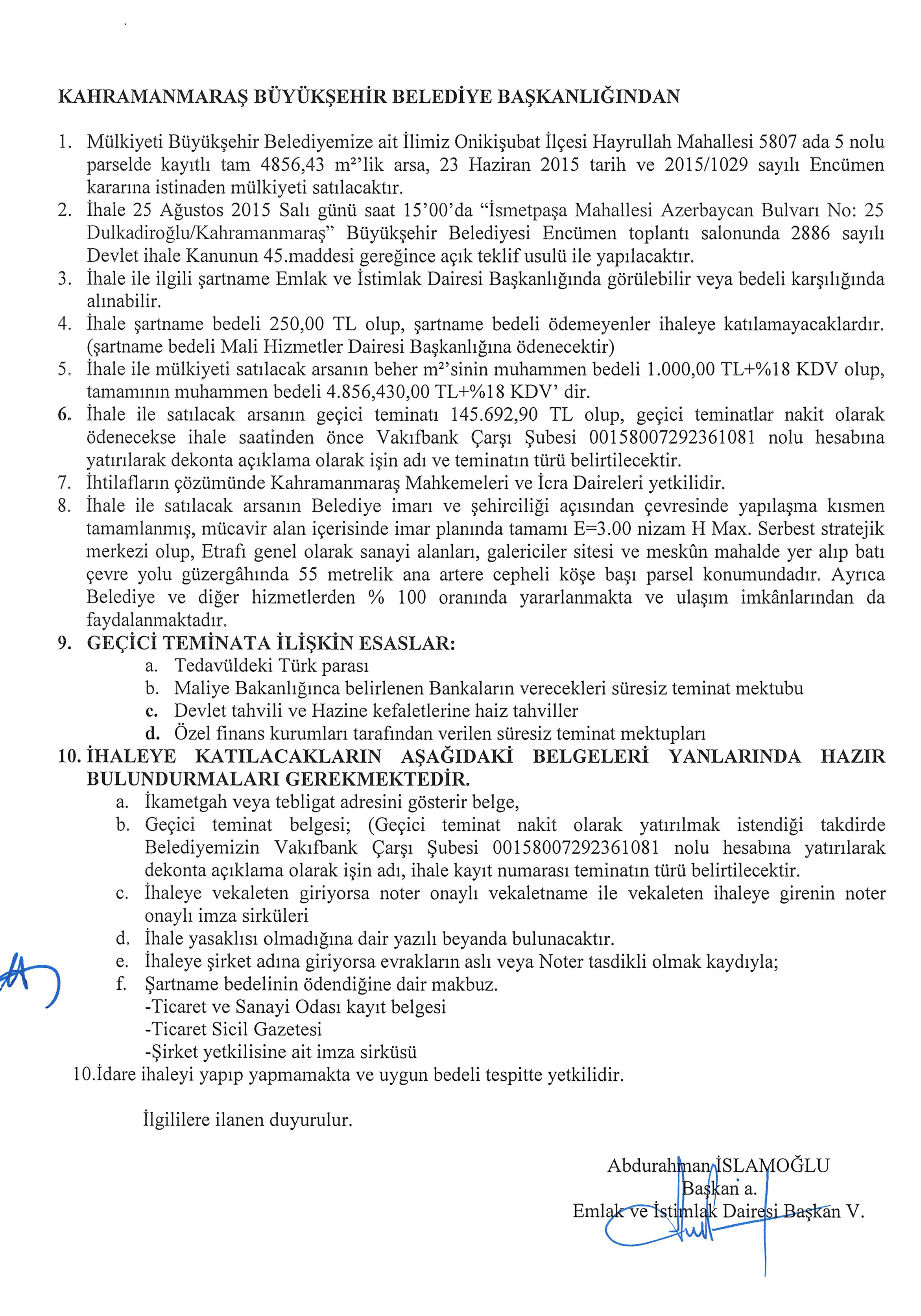 Mülkiyeti Büyükşehir Belediyemize ait arsa satılacaktır.