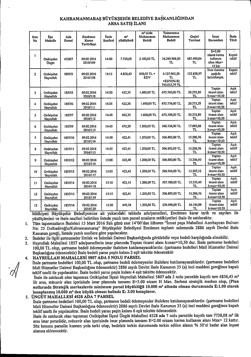 Mülkiyeti Büyükşehir Belediyemize ait Arsaların Satışı İlanı