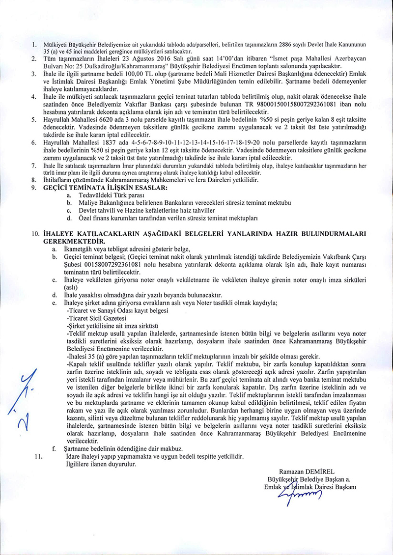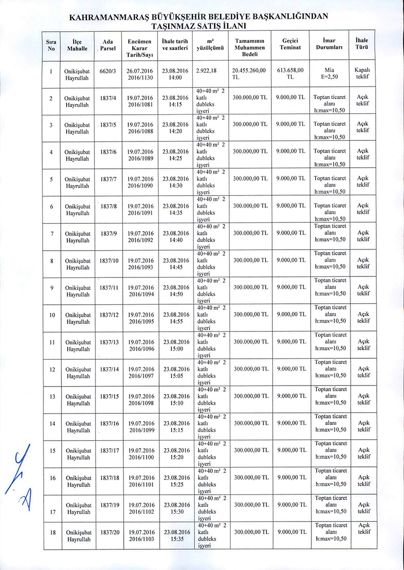 Mülkiyeti Büyükşehir Belediyemize ait İlimiz Merkez Onikişubat İlçesiHayrullah Mahallesi 6620 ada3 nolu parselde kayıtlı taşınmaz (2.922,18 m²)Devlet İhale Kanunun 35 (a) maddesi gereğince;HayrullahMahallesi 1837 ada 4 nolu parselde (40+40 m²), 5 noluparselde (40+40 m²), 6 nolu parselde (40+40m²), 7 nolu parselde (40+40m²), 8 nolu parselde (40+40 m²), 9 nolu parselde (40+40 m²), 10 noluparselde (40+40 m²), 11 nolu parselde (40+40 m²), 12 nolu parselde(40+40 m²), 13 nolu parselde(40+40 m²), 14 nolu parselde (40+40 m²), 15nolu parselde (40+40 m²), 16 nolu parselde (40+40 m²),17 nolu parselde(40+40 m²), 18 nolu parselde (40+40 m²),19 nolu parselde (40+40 m²) ve20 noluparselde (40+40 m²) lik 2 katlı dubleks işyerleri2886 sayılı Devlet İhale Kanunun 45 inci Maddesigereğince;mülkiyetleri satılacağından ihale ile ilgili ilan.