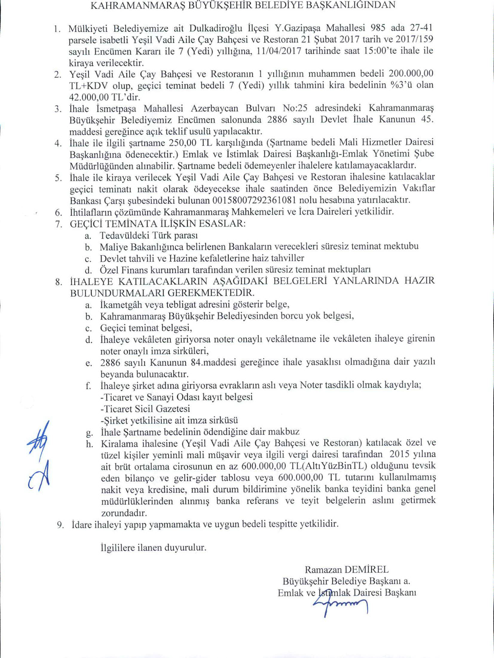 Mülkiyeti Belediyemize ait ekte ilanda yer alan Yeşil Vadi Aile Çay Bahçesi ve Restoran ihale ile kiraya verilecek
