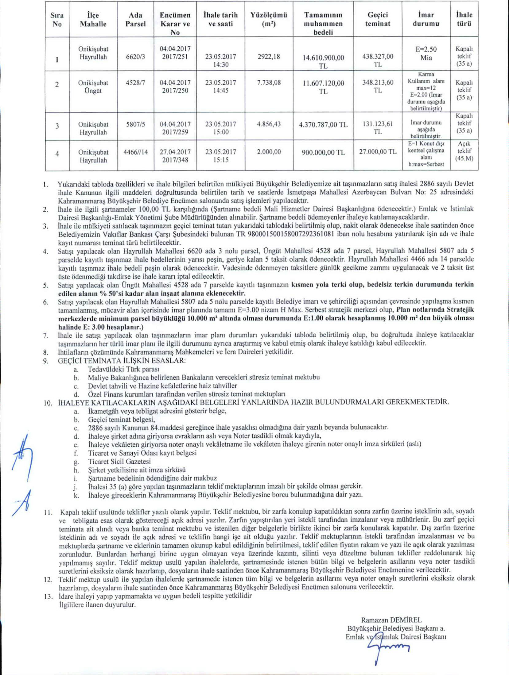 İhale Kanunun 35 (a) maddesi gereğince; Mülkiyeti Belediyemize ait İlimiz Onikişubat İlçesi Hayrullah