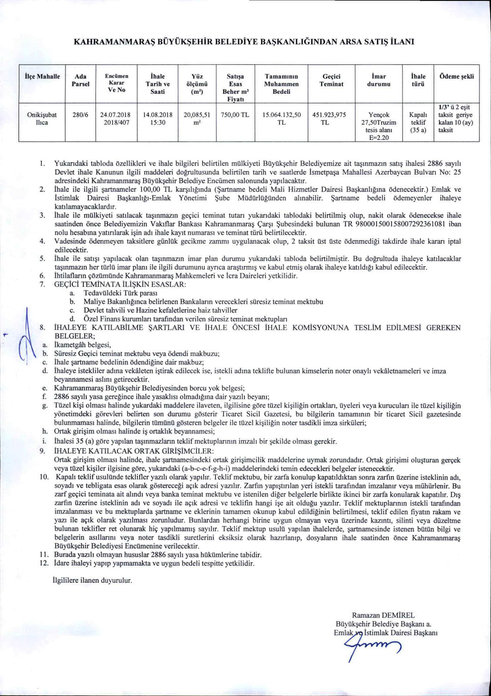 Mülkiyeti büyükşehir belediyemize ait olan ilanda bahsi geçen taşınmazın satışı