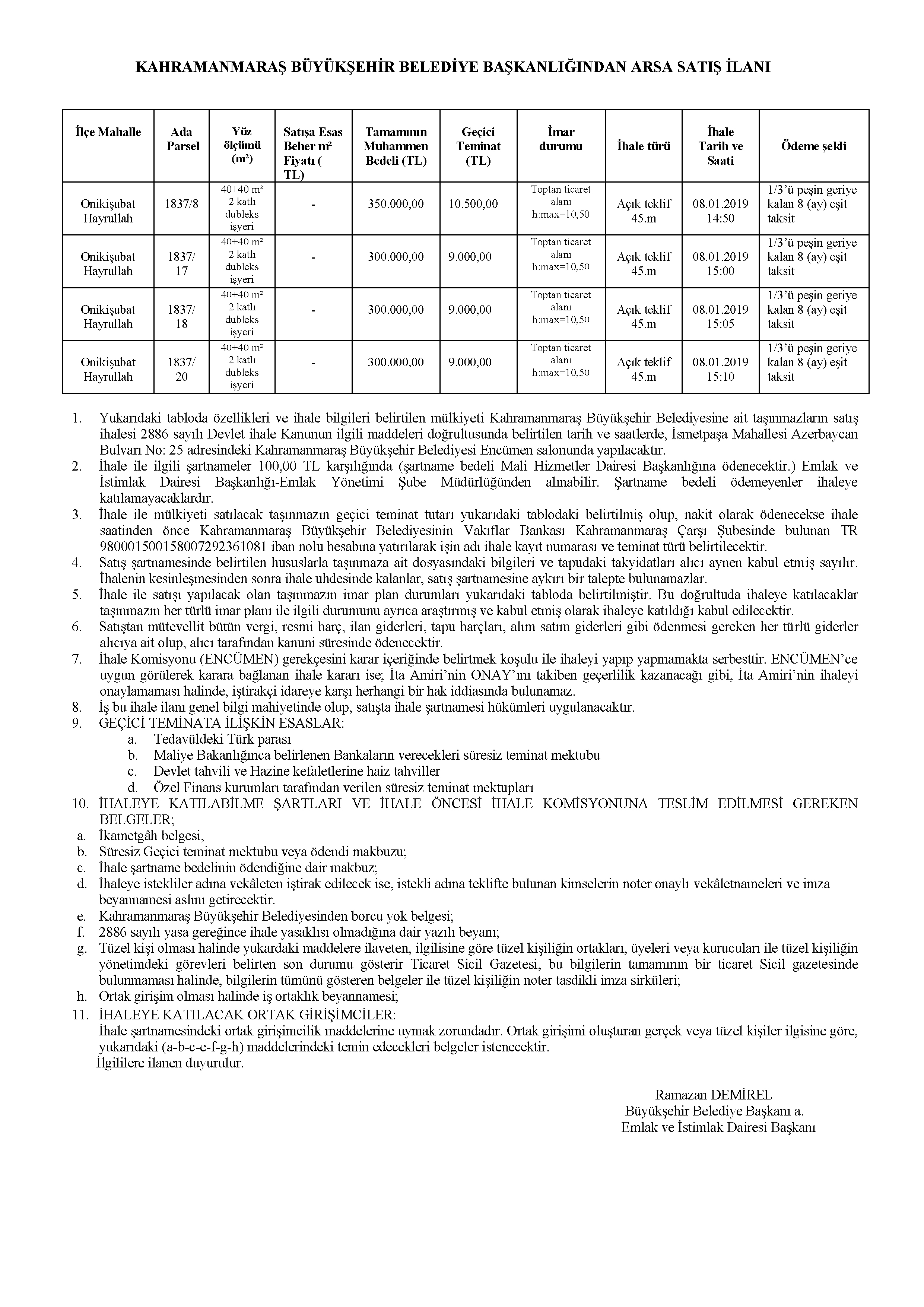 Büyükşehir Belediyemize ait ilanda belirtilen yerlerin satışı