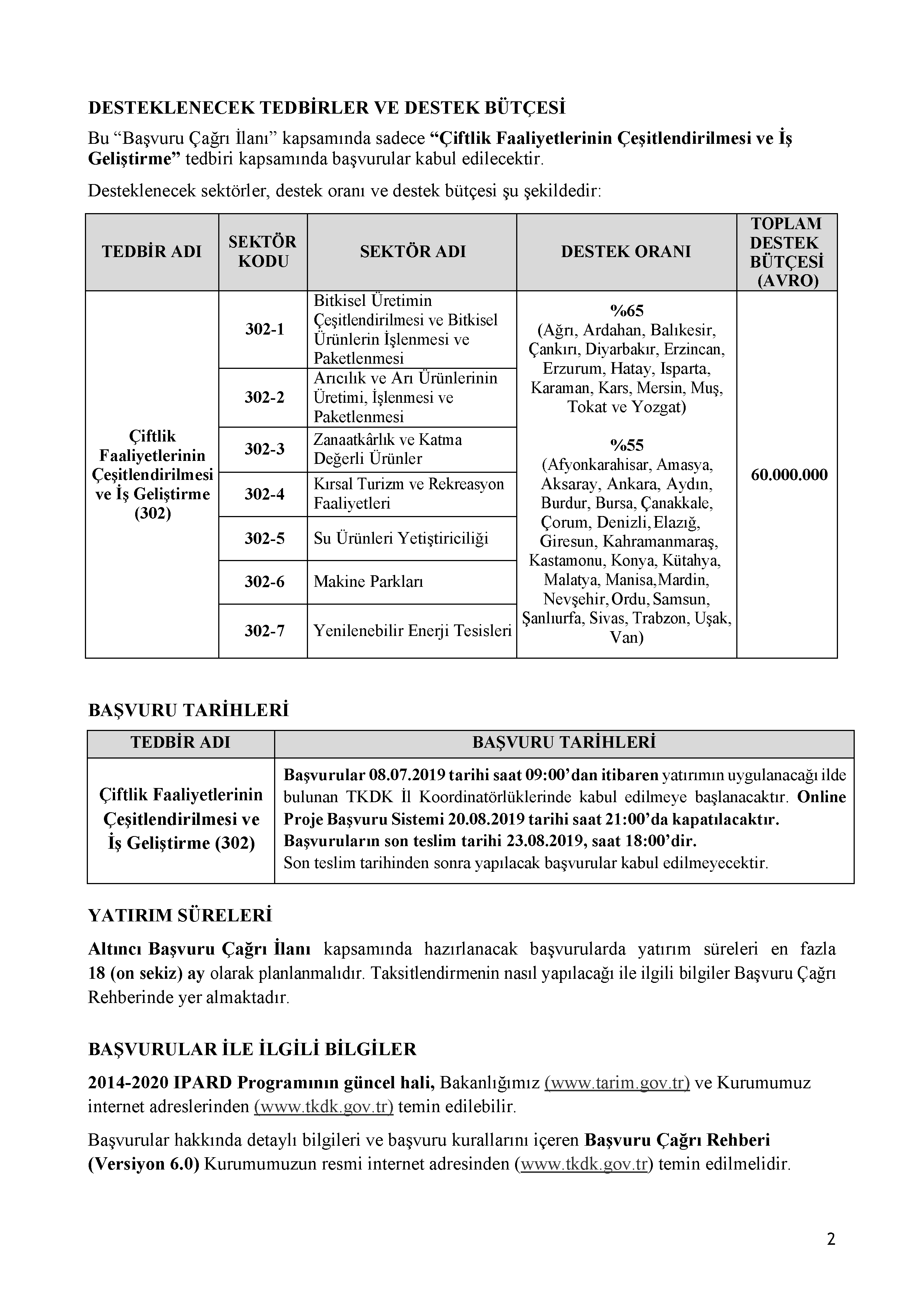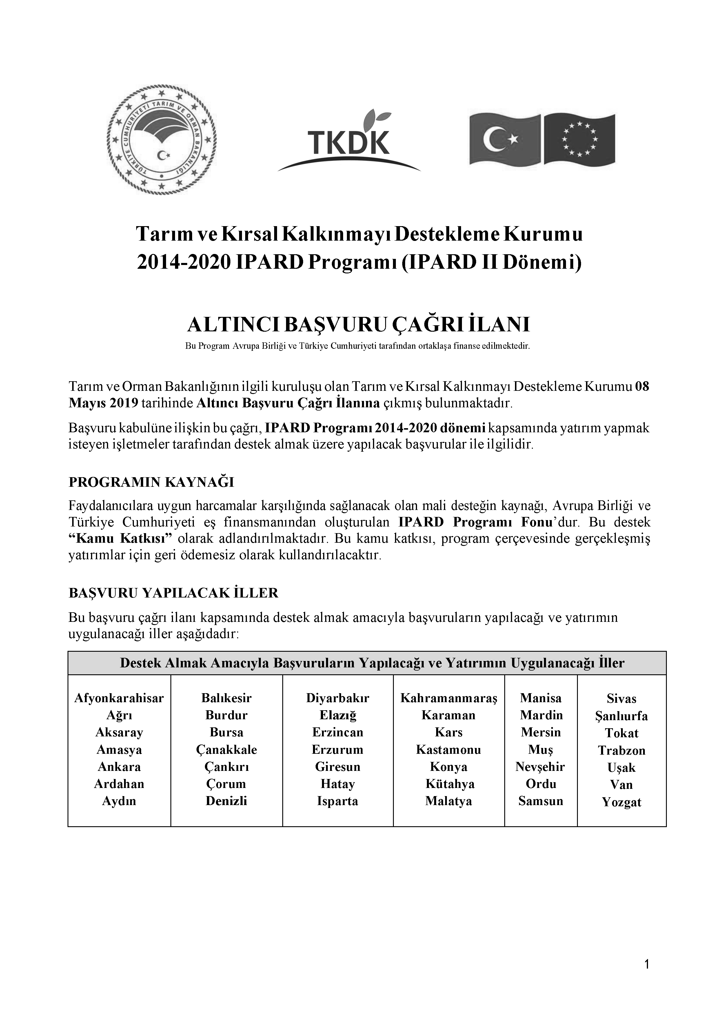 Tarım ve Orman Bakanlığının ilgili kuruluşu olan Tarım ve Kırsal Kalkınmayı Destekleme Kurumu 08 Mayıs 2019 tarihinde Altıncı Başvuru Çağrı İlanına çıkmış bulunmaktadır.