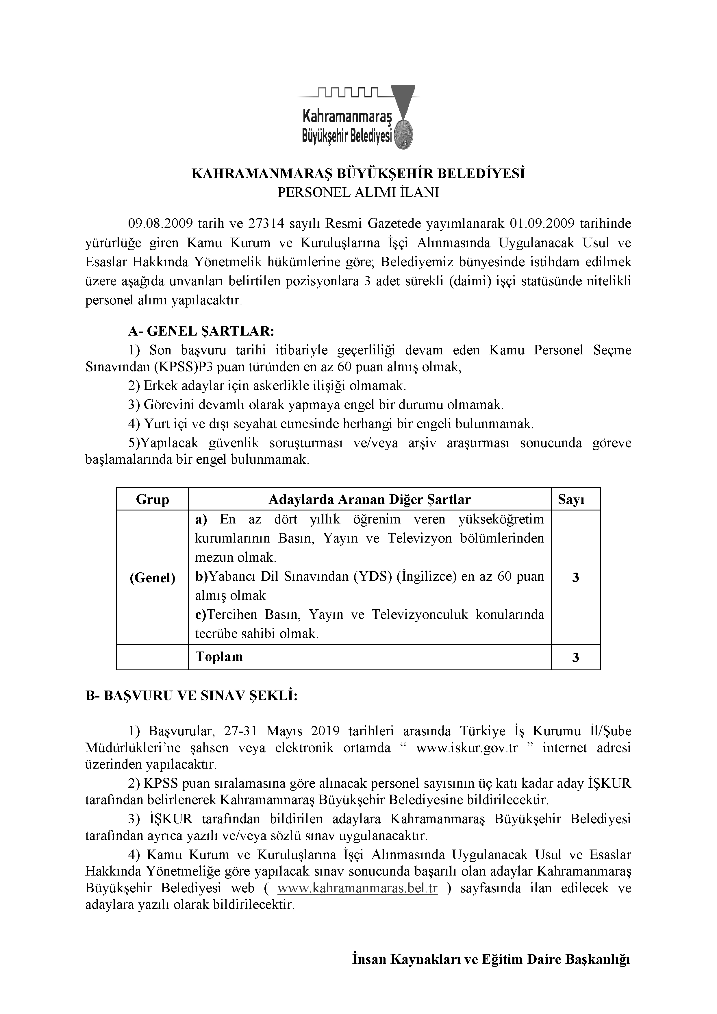 Ana Sayfa » Belediyemiz bünyesinde istihdam edilmek üzere aşağıda belirtilen unvanlarda çalıştırılmak üzere 3 (üç) adet daimi işçi statüsünde personel alımı yapılacaktır.