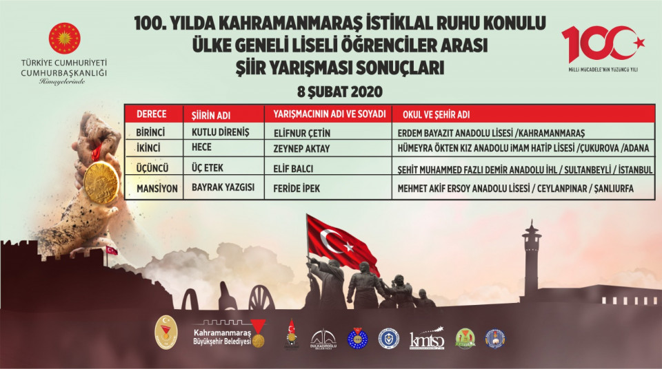 100. Yılda Kahramanmaraş İstiklal Ruhu Konulu Ülke Geneli Liseli Öğrenciler Arası Şiir Yarışması Sonuçları