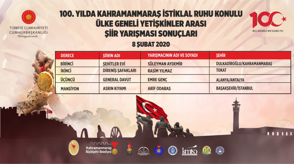 100. Yılda Kahramanmaraş İstiklal Ruhu Konulu Ülke Geneli Yetişkinler Arası Şiir Yarışması Sonuçları