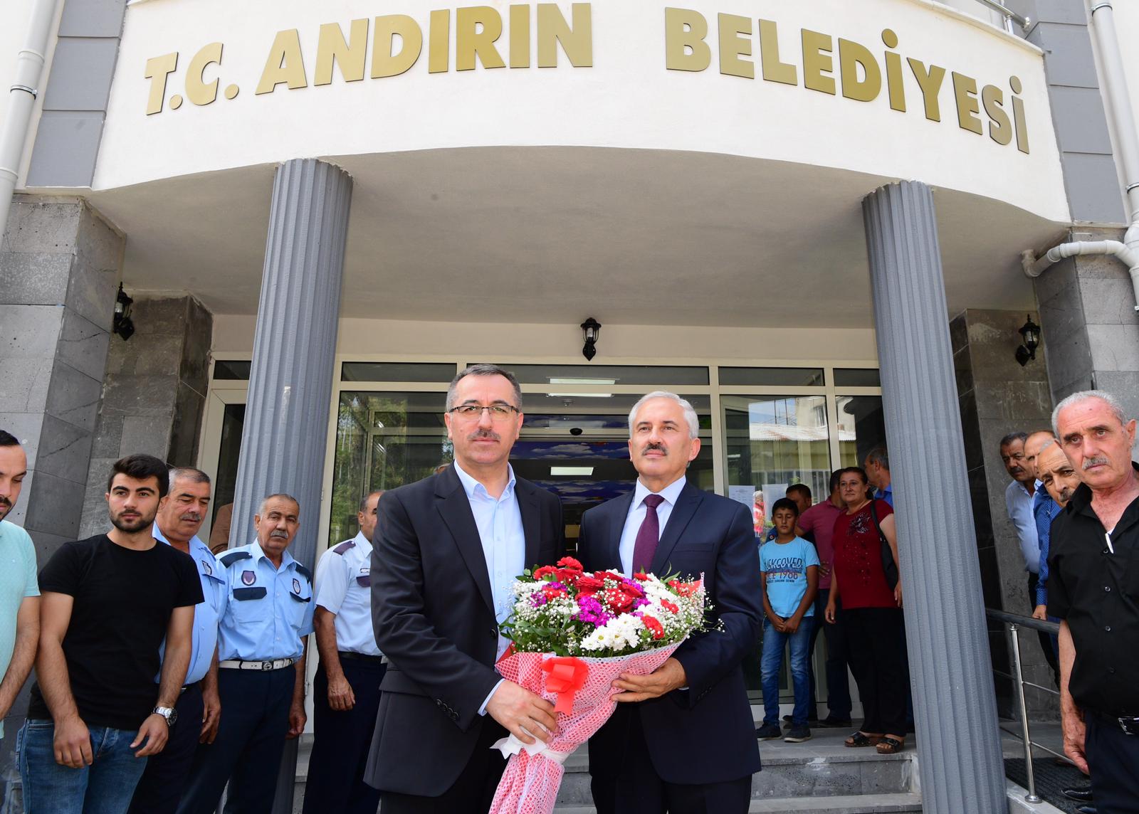 Andırın Belediyesi’ne gelişinde Başkan Güngör’ü, Andırın Belediye Başkanı Ahmet Doğan çiçekle karşıladı.
