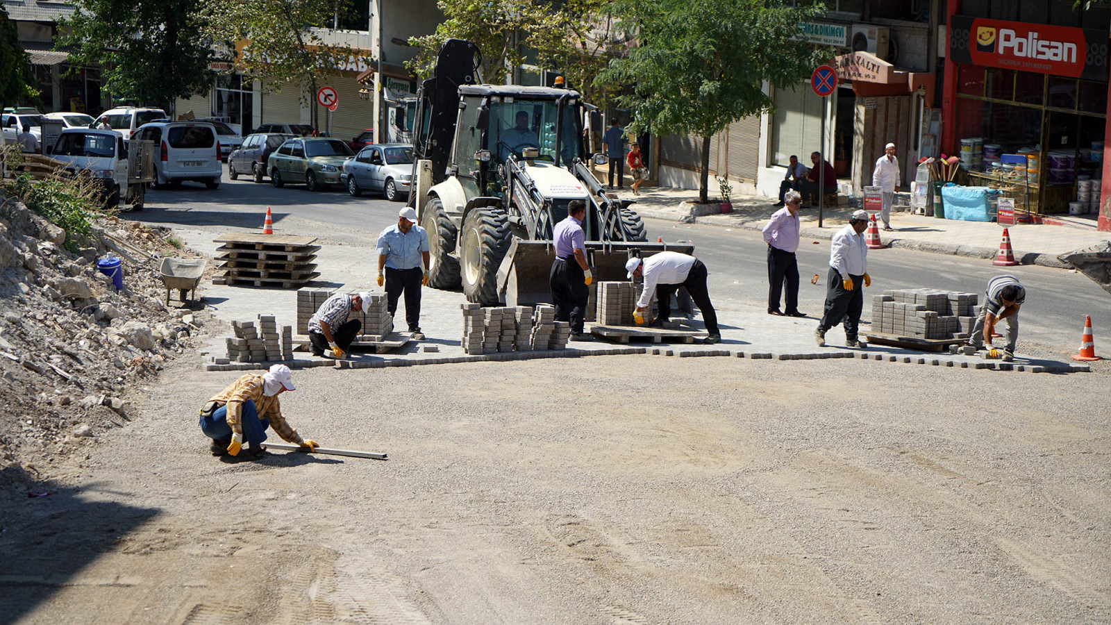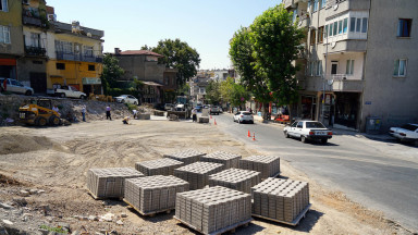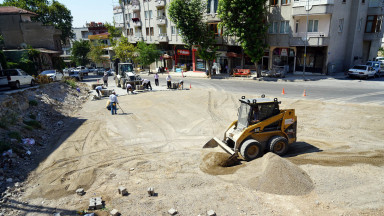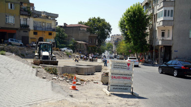 Eski İtfaiye- Kanlıdere arasında genişletme çalışmalarına başlanılan Sarayaltı Caddesi’nde kamulaştırma ve yıkım çalışmaları tamamlanan bölgelerde parke döşeme çalışmaları sürüyor.