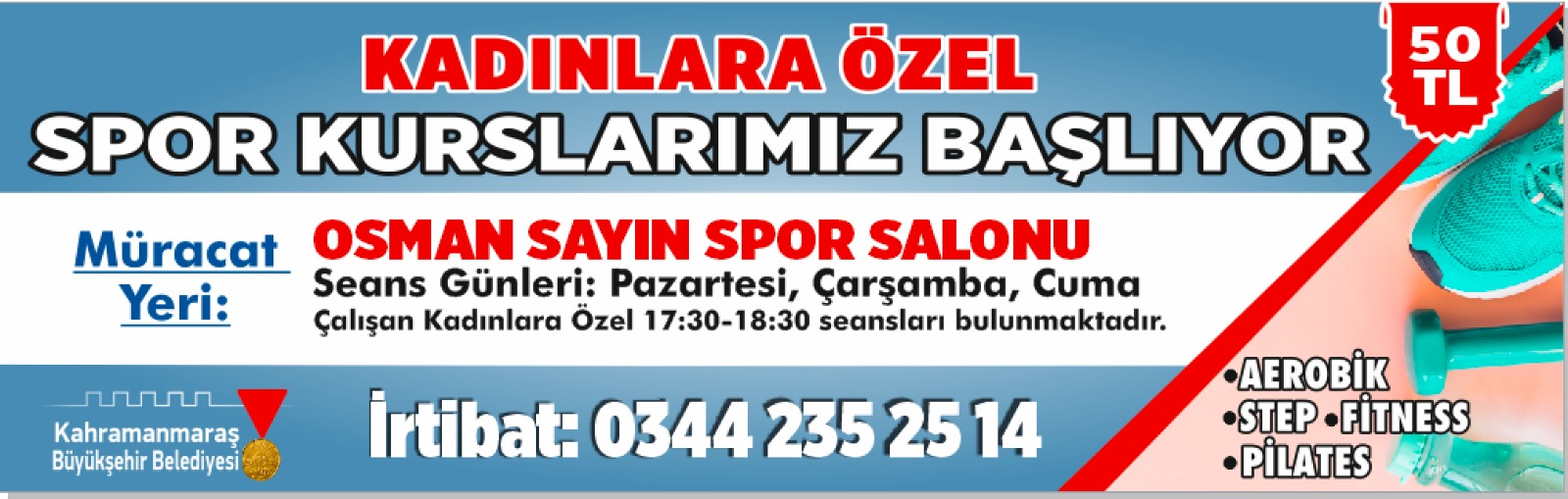 Kahramanmaraş Büyükşehir Belediyesi tarafından kadınlara yönelik 4 branşta açılan spor kurslarına kayıt başladı. Kültür Spor ve Turizm Dairesi Başkanlığı Gençlik ve Spor Şube Müdürlüğü tarafından Osman Sayın ve Necip Fazıl Spor Salonlarında gerçekleştirilecek kurslarda aerobik, step, fitness ve plates seansları yapılacak.