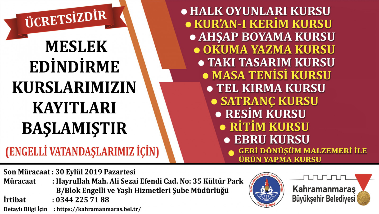 Kahramanmaraş Büyükşehir Belediyesi’nin engelli vatandaşlara yönelik hazırladığı Meslek Edindirme Kursları’nda kayıtlar başladı. Büyükşehir Belediyesi Engelli ve Yaşlı Hizmetleri Şube Müdürlüğü ile Suzan ve Abdulhakim Bilgili Halk Eğitim Merkezi Müdürlüğü işbirliğinde verilecek olan kursların kayıtları 30 Eylül Pazartesi gününe kadar devam edecek.