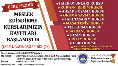 Engelli vatandaşların el becerilerini geliştirirken aynı zamanda sosyal yaşamlarına da katkı sağlama amacıyla düzenlenen kurslarda; Halk Oyunları, Kur’an-ı Kerim, Ahşap Boyama, Okuma-Yazma, Takı Tasarım, Masa Tenisi, Tel Kırma, Satranç, Resim, Ritim, Ebru ve Geri Dönüşüm Malzemeleri ile Ürün Yapma branşlarında eğitim verilecek. 30 Eylül’e kadar Kültürpark’ta bulunan Engelli ve Yaşlı Hizmetleri Şube Müdürlüğü’nde kayıt yaptırılabilecek.