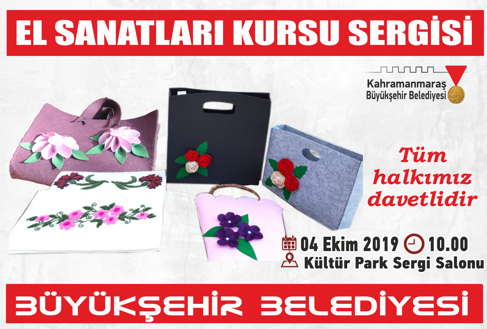 Konu ile ilgili olarak Büyükşehir Belediyesi Kadın ve Aile Şube Müdürlüğü’nden yapılan açıklamada: “Aile Danışma ve Eğitim Merkezlerimizde verilen eğitimlere katılan kursiyerlerimizin Keçe Tasarım, Punch ve Takı Tasarım branşlarında hazırladığı eserler 4 Ekim Cuma günü sergilenecek. Saat 10.00’da Kültürpark Sergi Salonu’nda düzenlenecek sergi açılış programına tüm hemşerilerimiz ve basın mensupları davetlidir” ifadeleri kullanıldı.