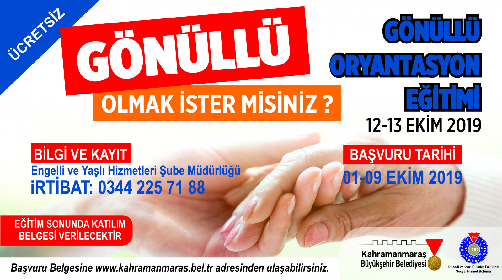 Kahramanmaraş Büyükşehir Belediyesi Sağlık ve Sosyal Hizmetler Dairesi Başkanlığı ve Sütçü İmam Üniversitesi Sosyal Hizmet Bölümü işbirliğiyle gerçekleştirilecek ‘Gönüllü Oryantasyon Eğitimi’ kayıtları başladı. 12 ve 13 Ekim tarihlerinde düzenlenecek eğitim programı için Büyükşehir Belediyesi internet sitesi üzerinden kayıt yapılabilecek.
