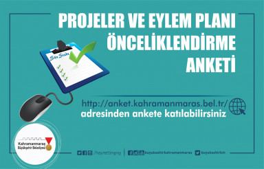Kahramanmaraş Büyükşehir Belediyesi, vatandaşla birlikte yönetim anlayışıyla 2019 – 2024 Projeler ve Eylem Planı Anketi’ni başlattı. Büyükşehir Belediyesi internet sitesinde yayınlanan anket ile İmar ve Planlama, Ulaşım ve Trafik, Altyapı, Yol ve Meydanlar, Çevre ve Temizlik, Park, Bahçe ve Sosyal Tesisler, Su ve Atıksu, Kültür, Sanat ve Turizm, Sosyal Hizmetler, Gençlik ve Spor, Yerel Kalkınma, Zabıta ve Denetim ile Dijital Dönüşüm başlıkları altındaki174 proje Kahramanmaraşlılar tarafından önceliklendirilecek.