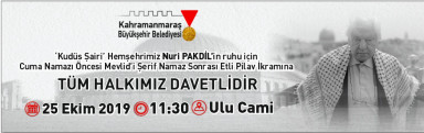 Kahramanmaraş Büyükşehir Belediyesi merhum Yazar Nuri Pakdil için Ulu Cami’de Mevlid-i Şerif okutacak. Büyükşehir Belediyesi Sağlık ve Sosyal Hizmetler Dairesi Başkanlığından yapılan açıklamada; “Merhum Yazar Nuri Pakdil için 25 Ekim Cuma saat 11.30’da, Ulucami’de Mevlid-i Şerif okutulacaktır. Tüm hemşerilerimiz davetlidir” denildi.