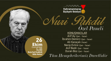 Kahramanmaraş Büyükşehir Belediyesi 6. Kitap ve Kültür Fuarı kapsamında geçtiğimiz günlerde hayatını kaybeden Kahramanmaraşlı fikir insanı Nuri Pakdil anısına panel düzenliyor. 26 Ekim Cumartesi günü Necip Fazıl Kısakürek Kültür Merkezi’nde gerçekleştirilecek programa Yazarlar Arif Ay, İbrahim Demirci, Ali Karaçalı, Necip Evlice, Atıf Bedir ve Duran Boz konuşmacı olarak katılıyor. Büyükşehir Belediyesi Kültür, Spor ve Turizm Dairesi Başkanlığı tarafından yapılan açıklamada, 14.00’da başlayacak panele tüm vatandaşların davetli olduğu belirtildi.