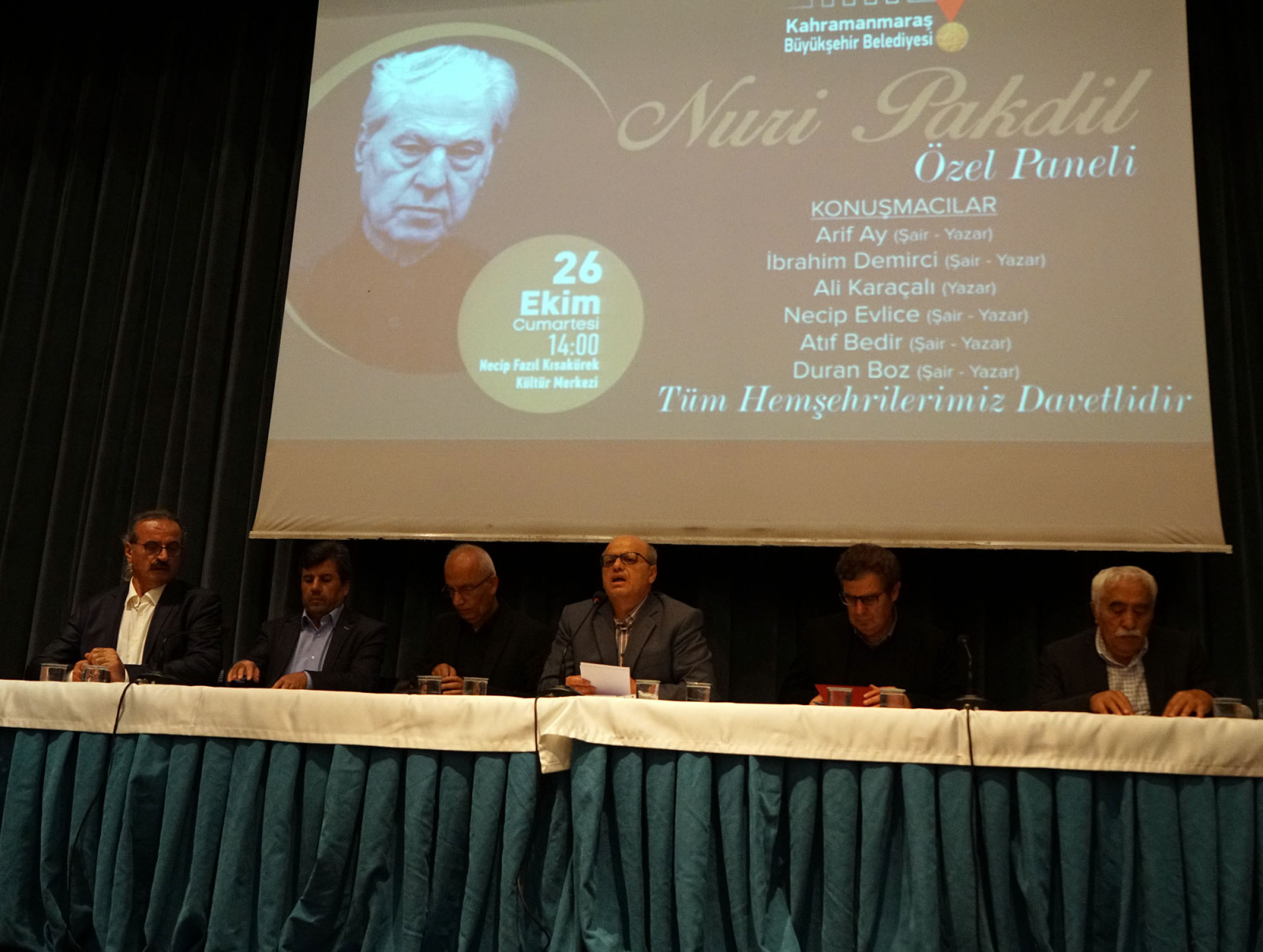 Büyükşehir Belediyesi 6. Kitap ve Kültür Fuarı kapsamında Kahramanmaraşlı fikir insanı Nuri Pakdil anısına özel panel düzenledi. Panele yazarlar Arif Ay, İbrahim Demirci, Ali Karaçalı, Necip Evlice, Atıf Bedir ve Duran Boz konuşmacı olarak katıldılar.