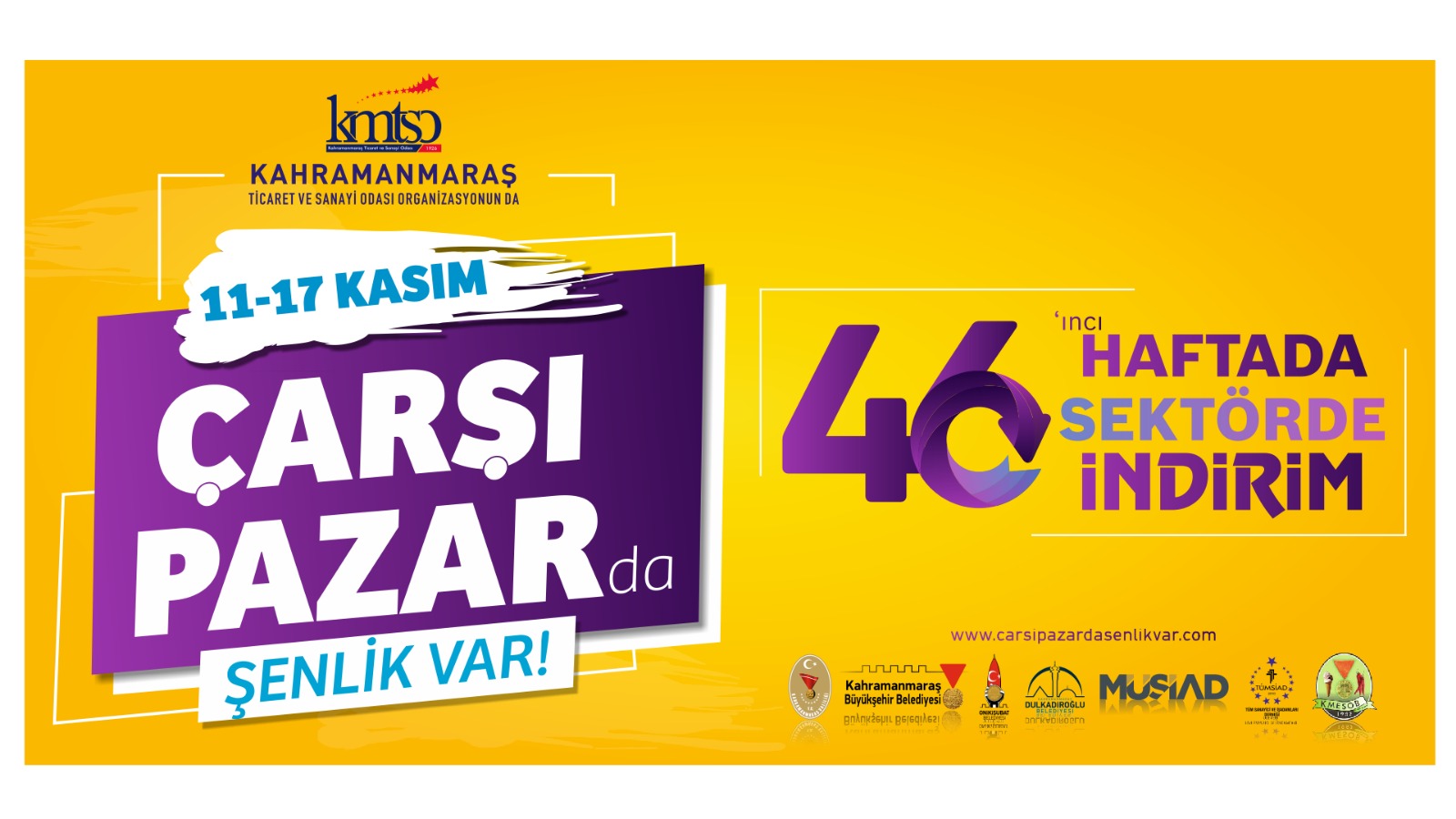 Kahramanmaraş Büyükşehir Belediyesi, Valilik ve STK’lar işbirliği ile şehirde Çarşı Pazar Şenliği başlıyor. Ticaret ve Sanayi Odası organizasyonunda, MÜSİAD, TÜMSİAD ve KMESOB üyelerinin katılımıyla gerçekleştirilecek şenlikte 46 sektör yer alacak. 11 – 17 Kasım tarihleri arasında gerçekleştirilecek şenlik kapsamında ürünlerde yüzde 46’ya varan indirimler yapılacak.