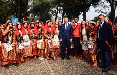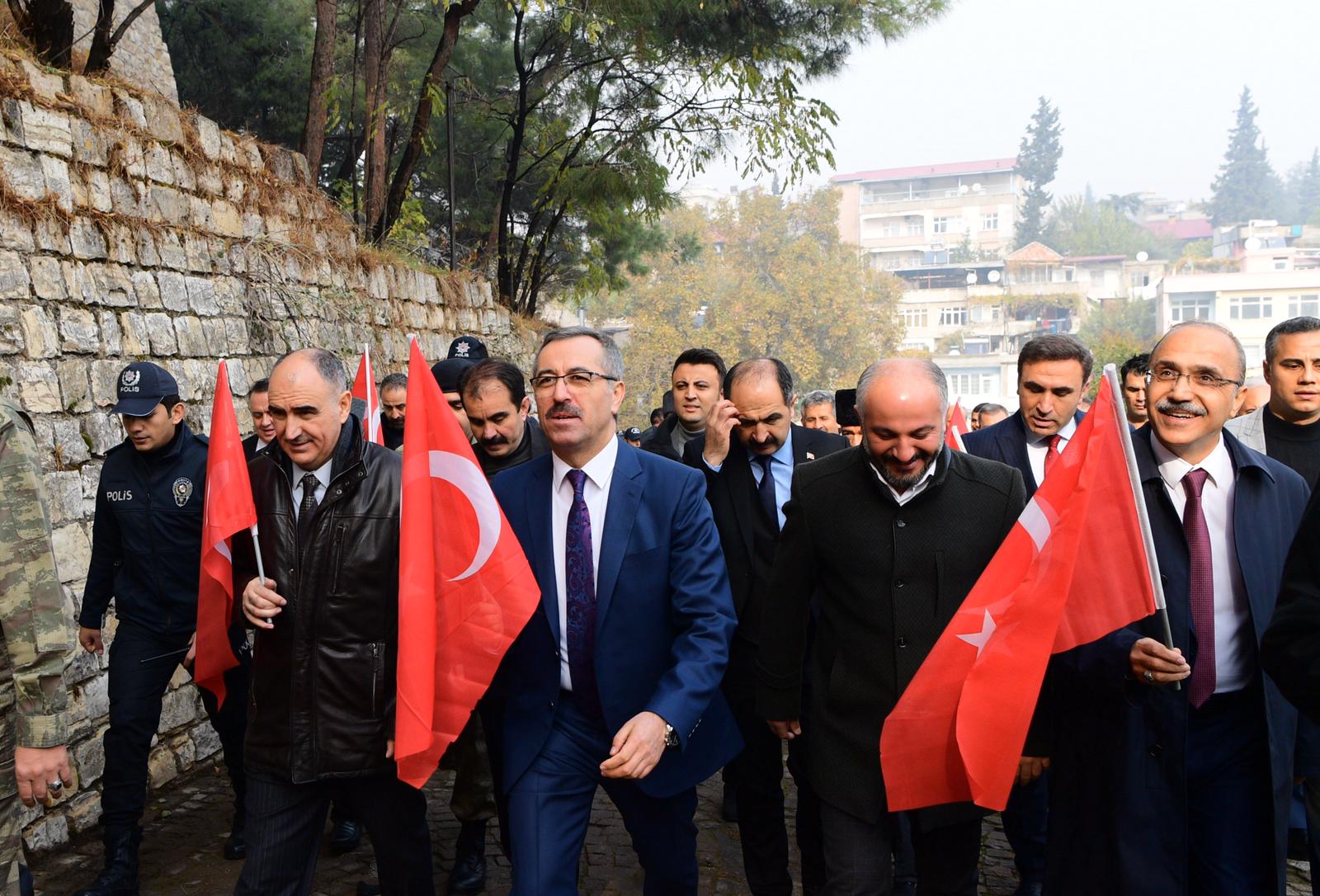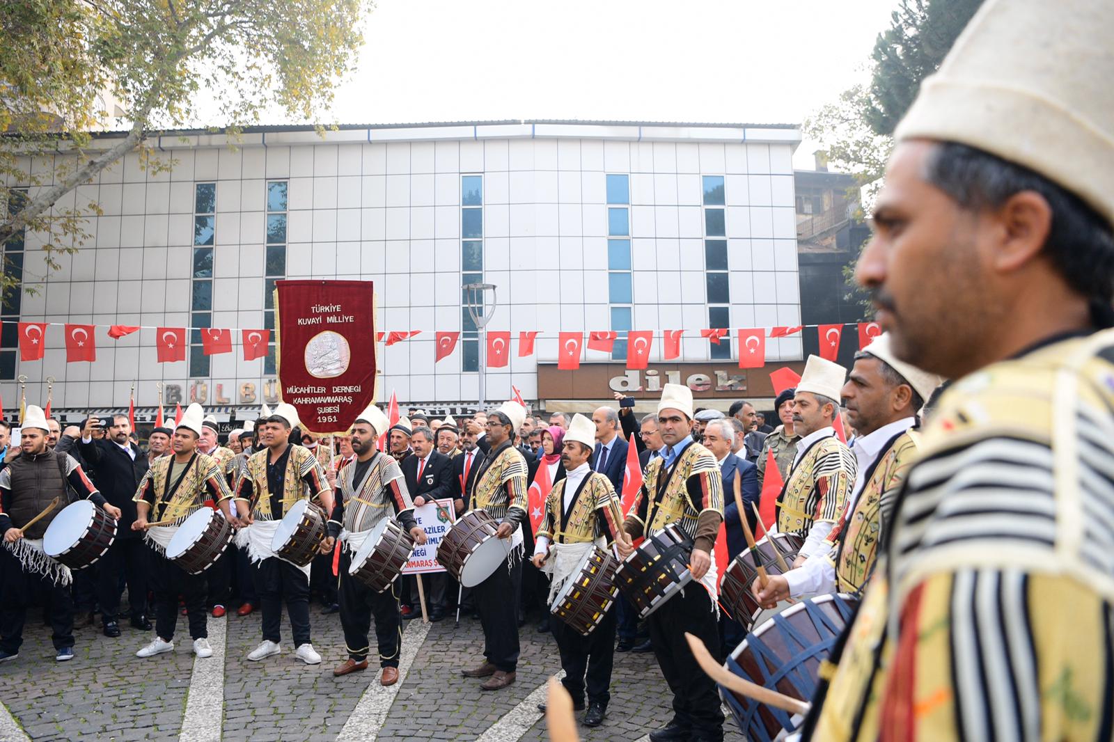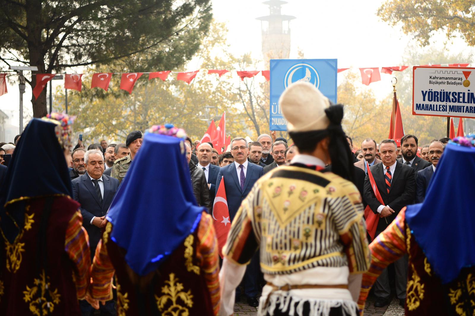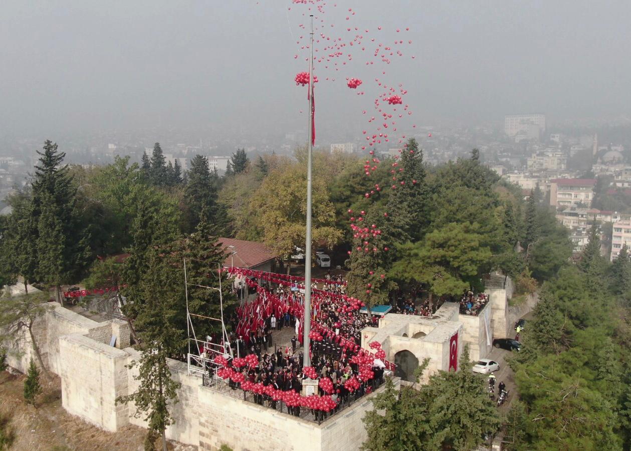 Kahramanmaraş Büyükşehir Belediyesi Mehteran Takımı’nın kahramanlık marşlarından oluşan konseri, Abdal Halil Ağa’nın torunlarının davul gösterisi ve halk oyunları ekibinin performansının ardından tüm katılımcılar kaleye yürüdü. Başkan Güngör, Vali Özkan, Garnizon Komutanı Terzioğlu, STK temsilcileri, öğrenciler ve vatandaşlardan oluşan kortej Tarihi Maraş Kalesi’ne çıkarak Türk Bayrağı’nı göndere çekti.