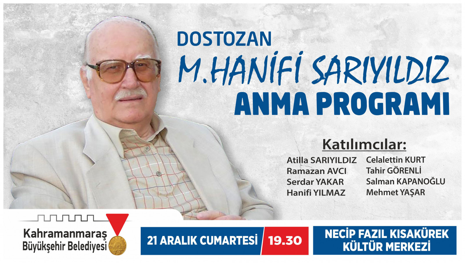 Kahramanmaraş Büyükşehir Belediyesi, Dostozan M. Hanifi Sarıyıldız için "Anma Programı" düzenliyor. Necip Fazıl Kısakürek Kültür Merkezinde gerçekleştirilecek anma programında; Atilla Sarıyıldız, Ramazan Avcı, Serdar Yakar, Hanifi Yılmaz, Celalettin Kurt, Tahir Görenli, Salman Kapanoğlu ve Mehmet Yaşar konuşmacı olarak yer alacak. Program 21 Aralık Cumartesi saat 19.30’da gerçekleştirilecek.