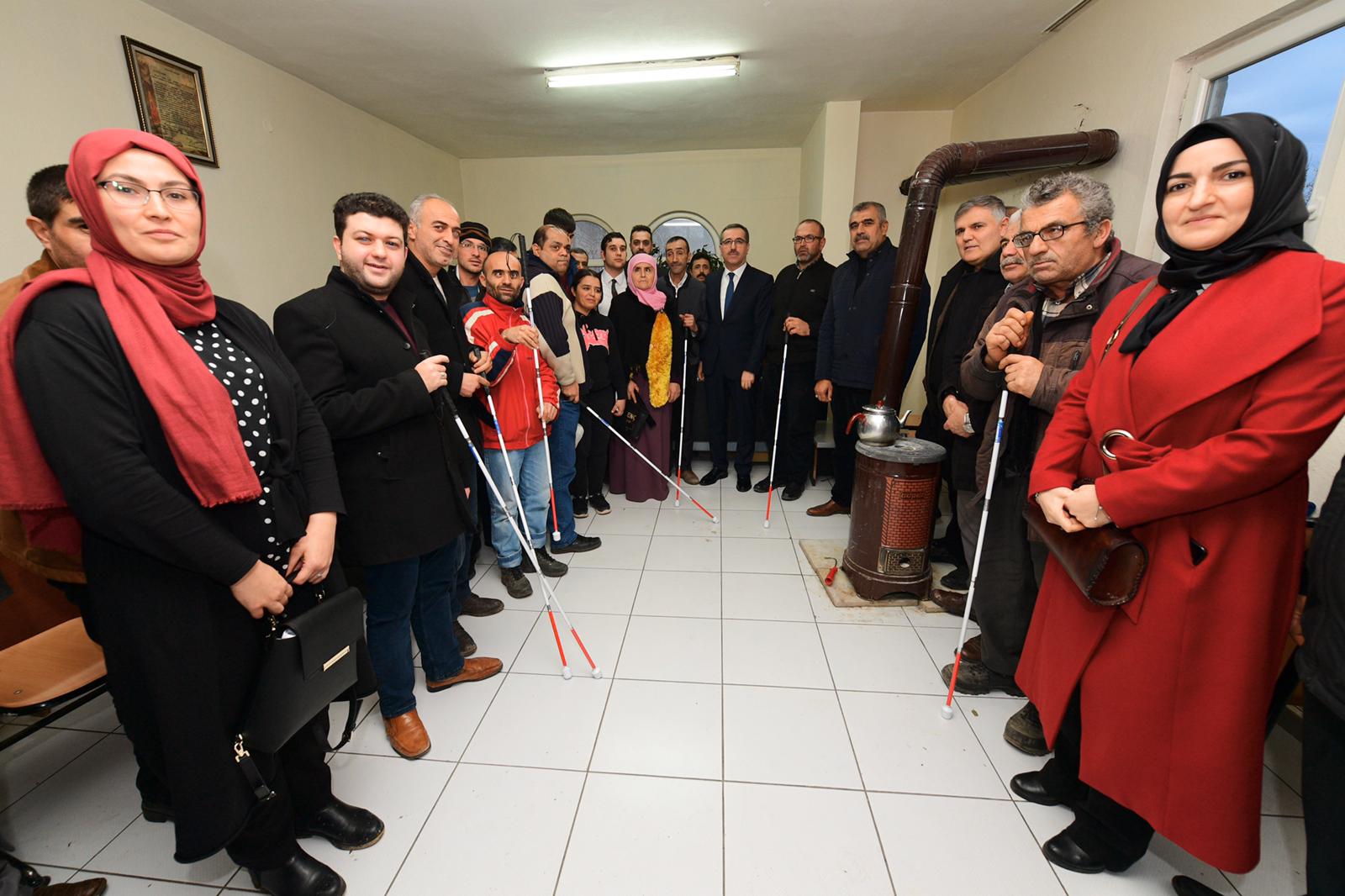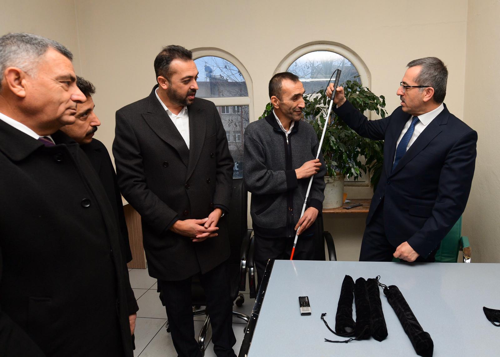 Başkan Güngör açıklamaların ardından 60 civarında beyaz bastonu görme engelli dernek üyelerine hediye etti.